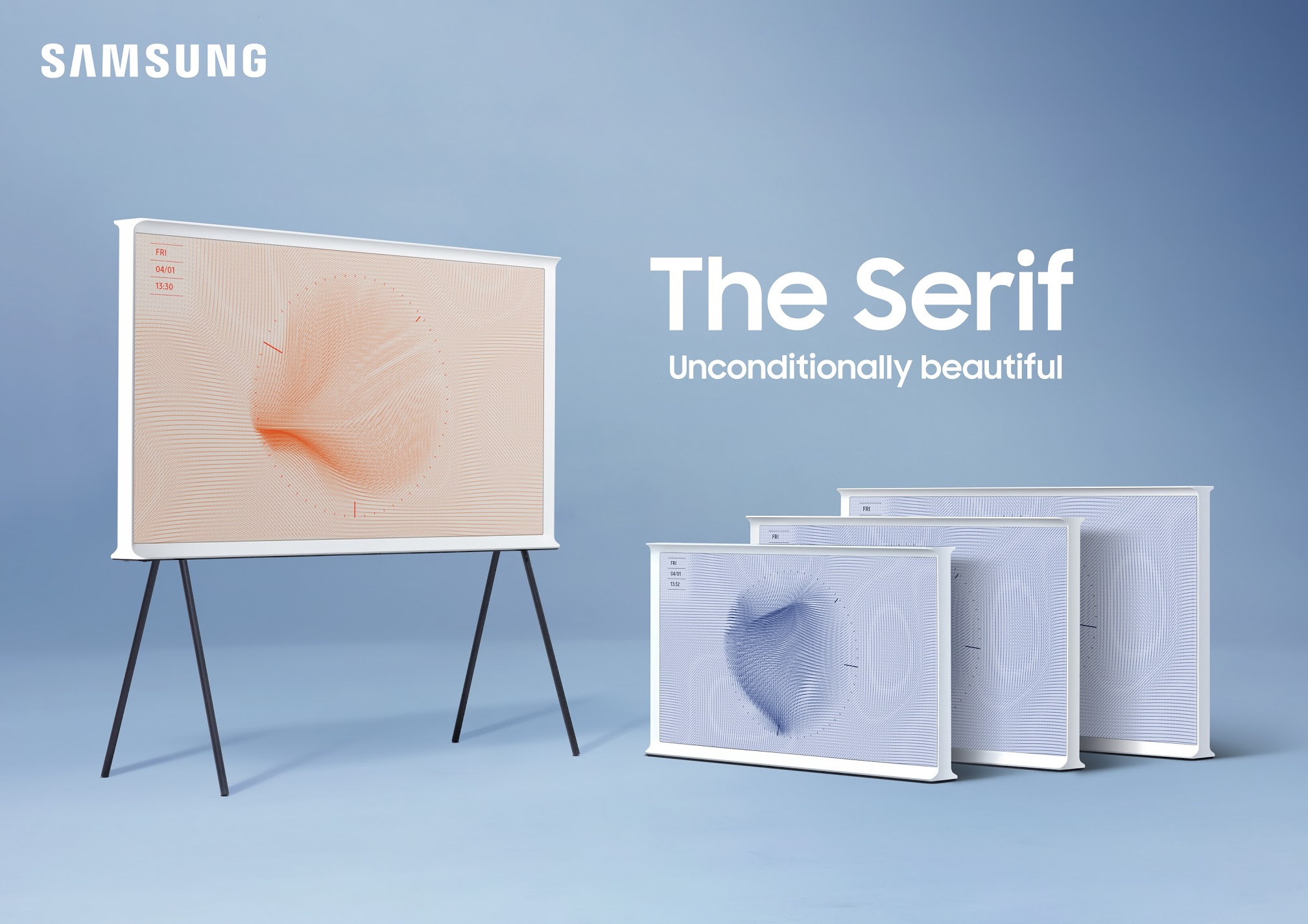 The new Serif comes in two sizes, a 55 inch screen and a 43 inch screen. It also has the ability to display imagery and blend into your living space by recreating the pattern of your wall on screen, but the frame itself is white in colour.