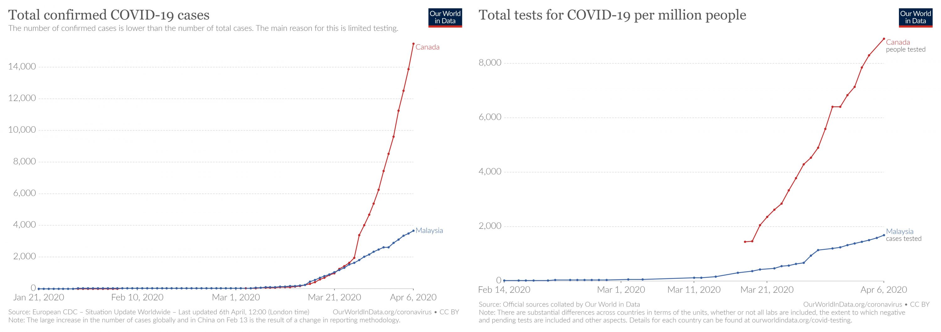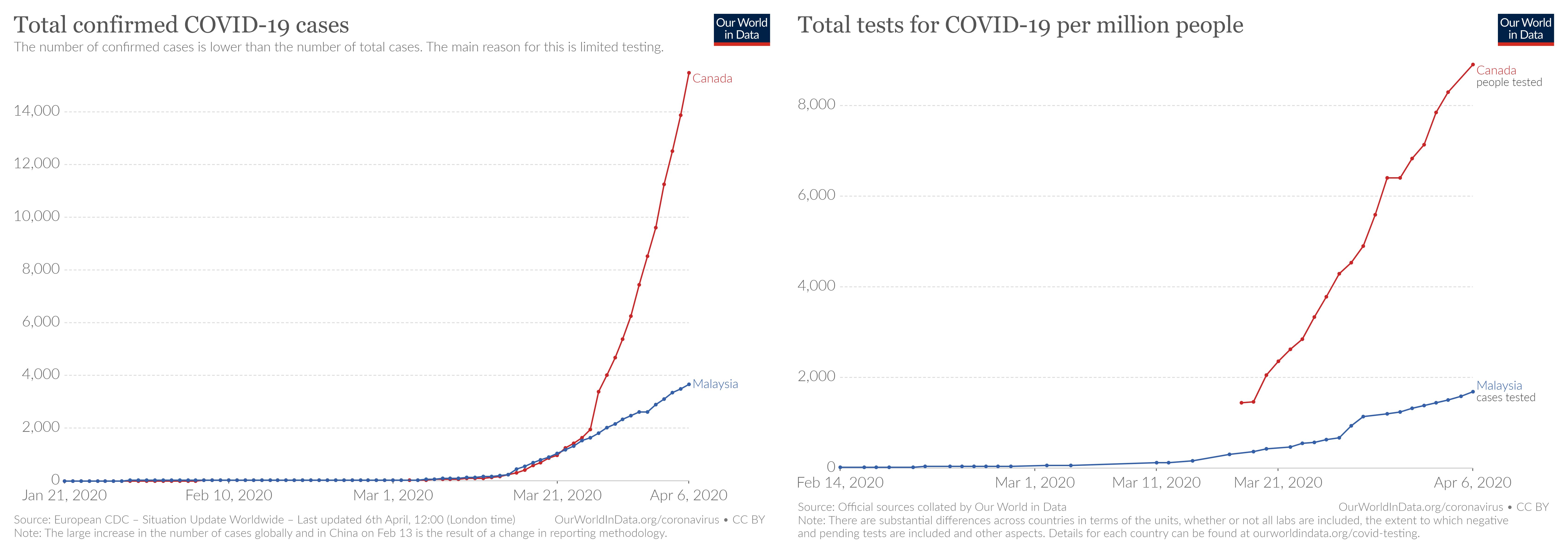 The number of tests we do determines the cases we find and report. If we compare Canada and Malaysia, a comparison I have seen online as our population sizes are similar, you will note (on the left) that they have many more cases than us. But also note (on the right) that they do a huge number of tests per million population compared to us. The stark similarity of both graphs speaks for itself. In this epidemic, you get the numbers you test for.