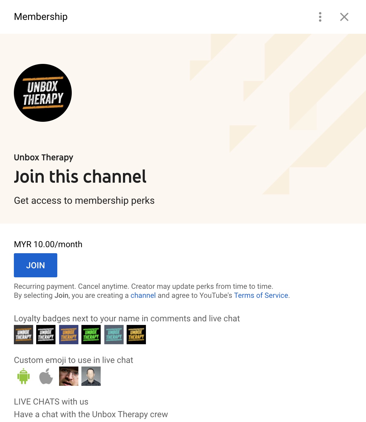 Most of the creators that offer the membership let you join for RM10 per month to receive loyalty badges next to your name in comments and live chat, custom emojis that relate to the channel as well as other online perks. Unbox Therapy, MKBHD, Linus Tech Tips, Dave2D, and Vox are amongst the tech-related channels that offer the membership.