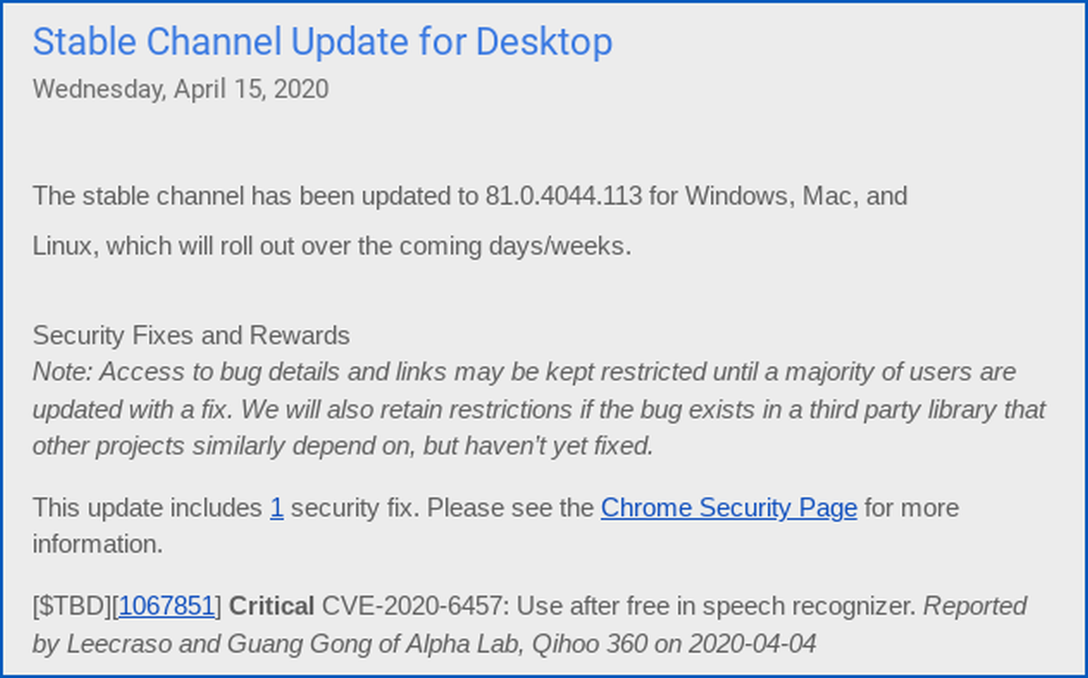 It is a little strange that the timeline being set by Google is “weeks/months”, rather than days. Describing a security fix as “critical” would seem to imply that the vulnerability is a dangerous one. Plus, the update note does not make any reference to open-sourced Chromium-based browsers, such as Microsoft Edge.