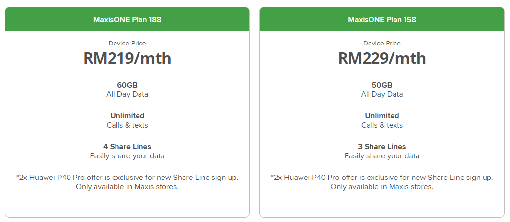 The higher-spec P40 Pro which is sold for RM3,899 outright is going for RM219/month for two units on MaxisONE 188 + MaxisONE Share 48 (RM455/month all-in without taxes). On MaxisONE 158 + MaxisONE Share 48, it will cost you RM229/month for the devices or RM435/month all-in without taxes.