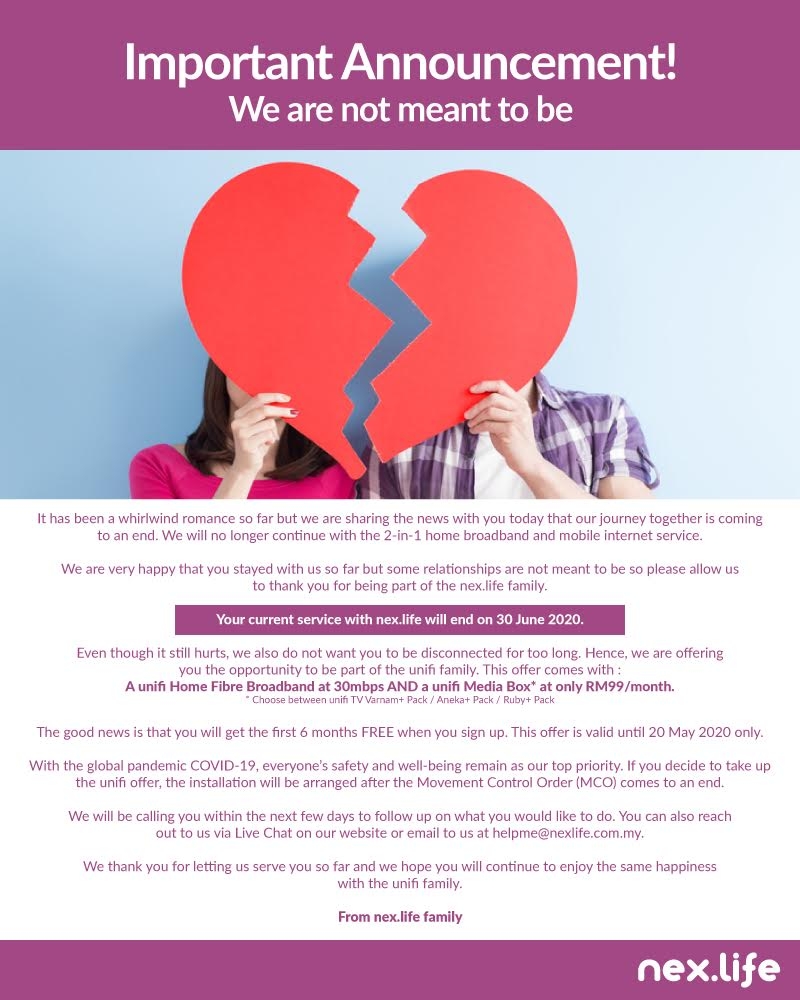 As highlighted by one of our readers, customers have received a notification that Nex.Life will end its service on 30th June 2020. To ensure continued connectivity, existing users will be offered to switch to Unifi with a special introductory offer.