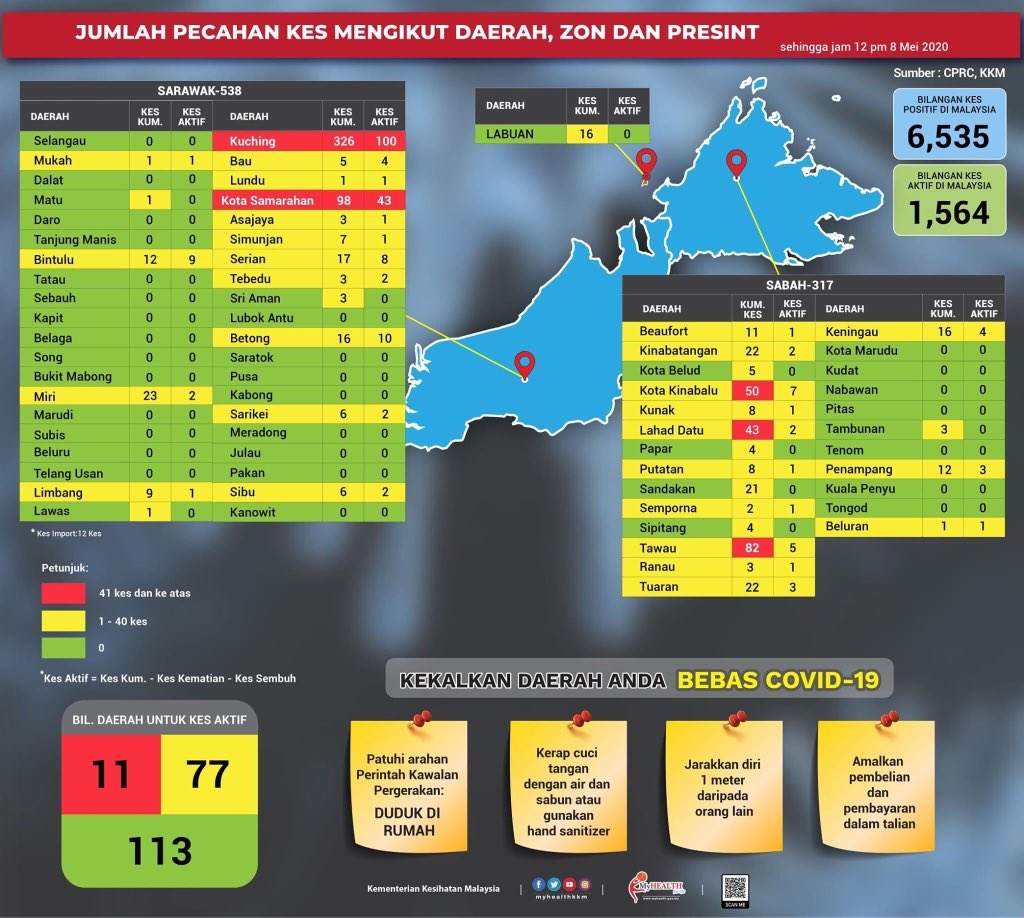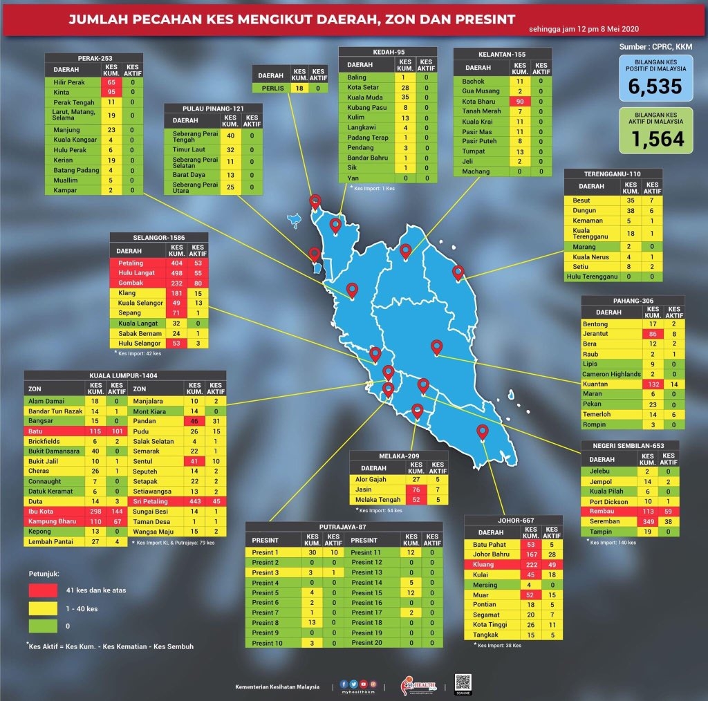 At the moment, there are a total of 113 green zones, 77 yellow zones and 11 red zones. The northern states of Perak, Pulau Pinang, Perlis, Kedah and Kelantan are fully green with no new cases recorded.