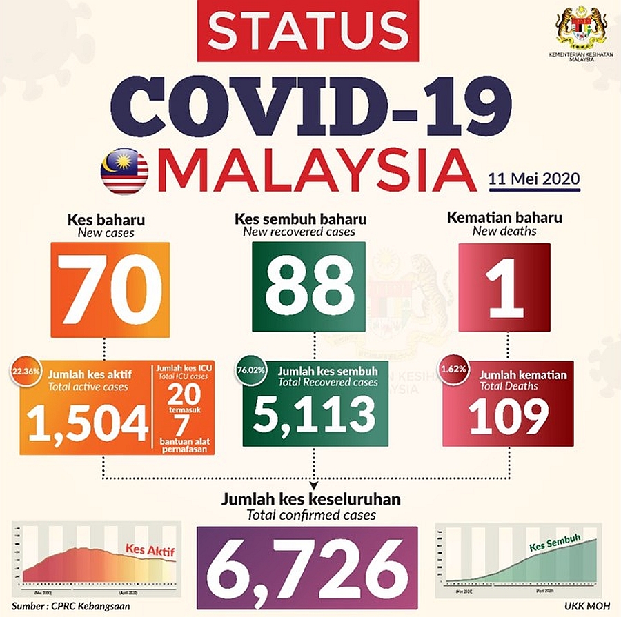 The Ministry of Health has reported 70 new COVID-19 cases in Malaysia today, which is the highest since the CMCO was introduced on 4th May. This brings the total number of infections to 6,726.