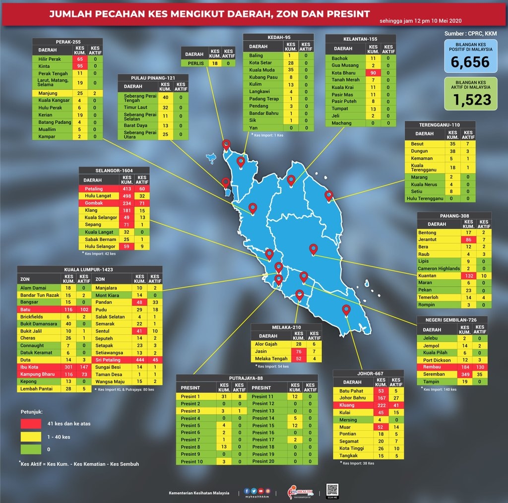 At the moment, there are a total of 9 red zones as of 12am on the 10th of May. Kota Samarahan which was a red zone previously has turned yellow as the number of active cases has dropped below 40. There are now 116 green zones and 76 yellow zones. The northern states of Pulau Pinang, Perlis, Kedah and Kelantan are fully green, however, Perak now has a new yellow zone after recording two new cases in Manjung yesterday.