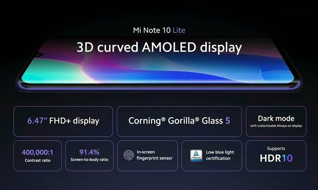 The Xiaomi Mi Note 10 Lite features a 6.47″ AMOLED display that pushes a Full HD+ resolution. The screen is curved at both edges and it is protected by Corning Gorilla Glass 5. Similar to its other Mi Note 10 siblings, it also comes with tiny notch and has an in-display fingerprint sensor.