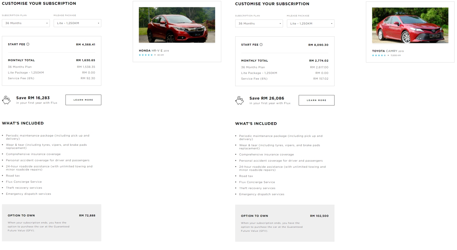 Based on the example provided by Flux, you’ll pay 58% less for upfront payment and spend 33% less overall in the first year of ownership for a Honda HR-V E (RRP: RM108,800). The comparison is based on a car loan tenure of 5 years. Since the subscription covers wear and tear, you won’t need to pay for insurance, road tax, servicing and additional costs for wear and tear.