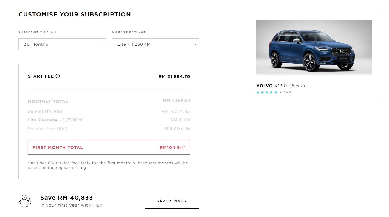 During sign up, you’ll have to pay a non-refundable start fee. For the Toyota Vios, the start fee is RM3,692.19 on a 36-month contract with 1,250km monthly mileage. Meanwhile, for the Volvo XC90 T8, the start fee costs RM21,884.76 for the same contract option.