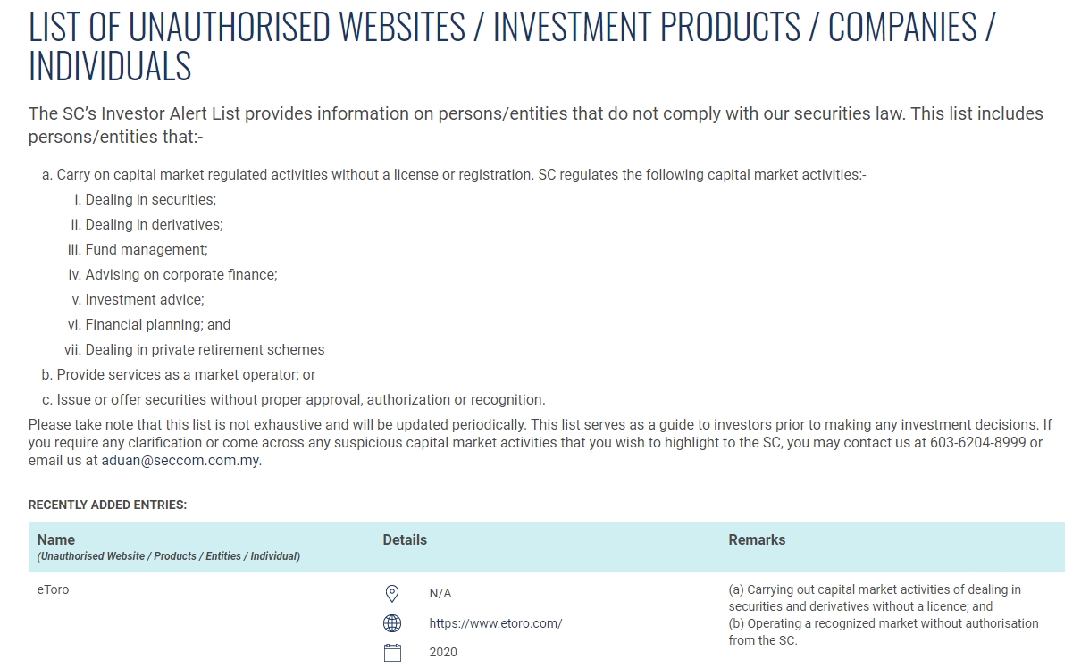 [ UPDATE 20/05/22 09:00 ] Securities Commission has added eToro into its list of unauthorised websites, investment products, companies and individuals.