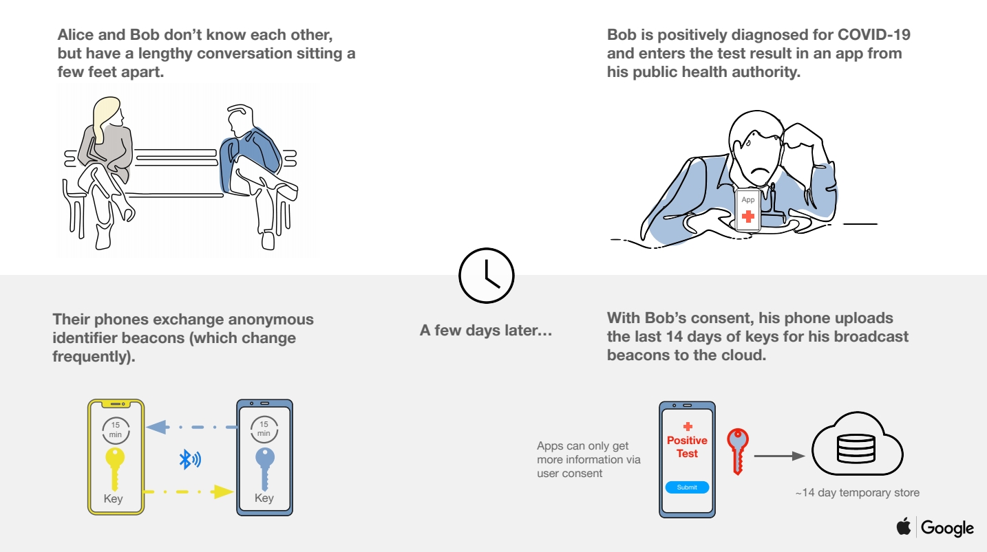Depending on the contact tracking app, the API also offers the option to report themselves as positive. The users will have full control to submit their COVID-19 positive diagnosis and to submit all keys associated to their devices with the public health authority. The matching for exposure notification only takes place on the device and it is under the user’s control.
