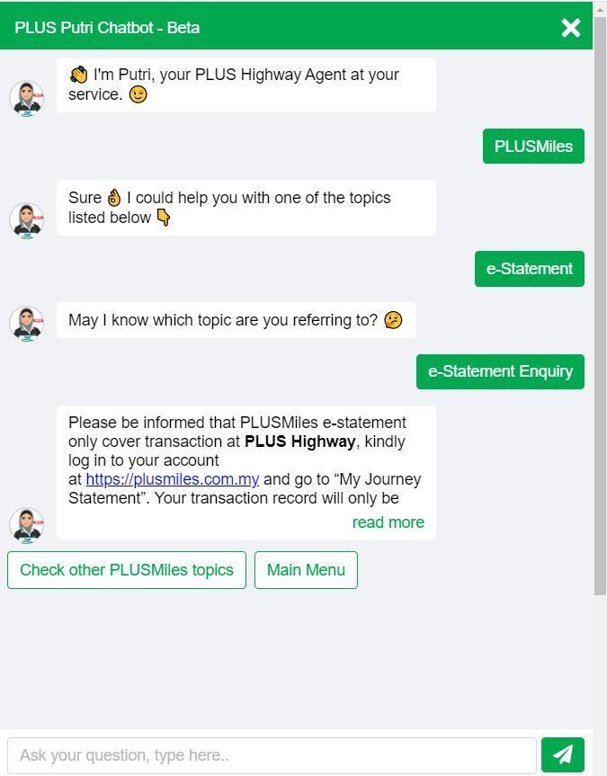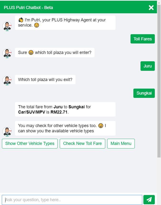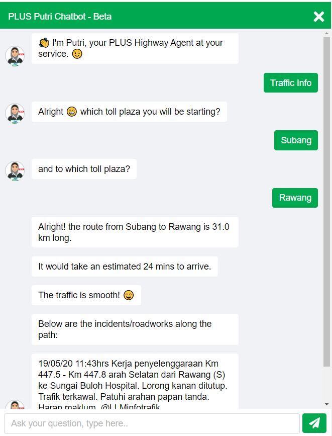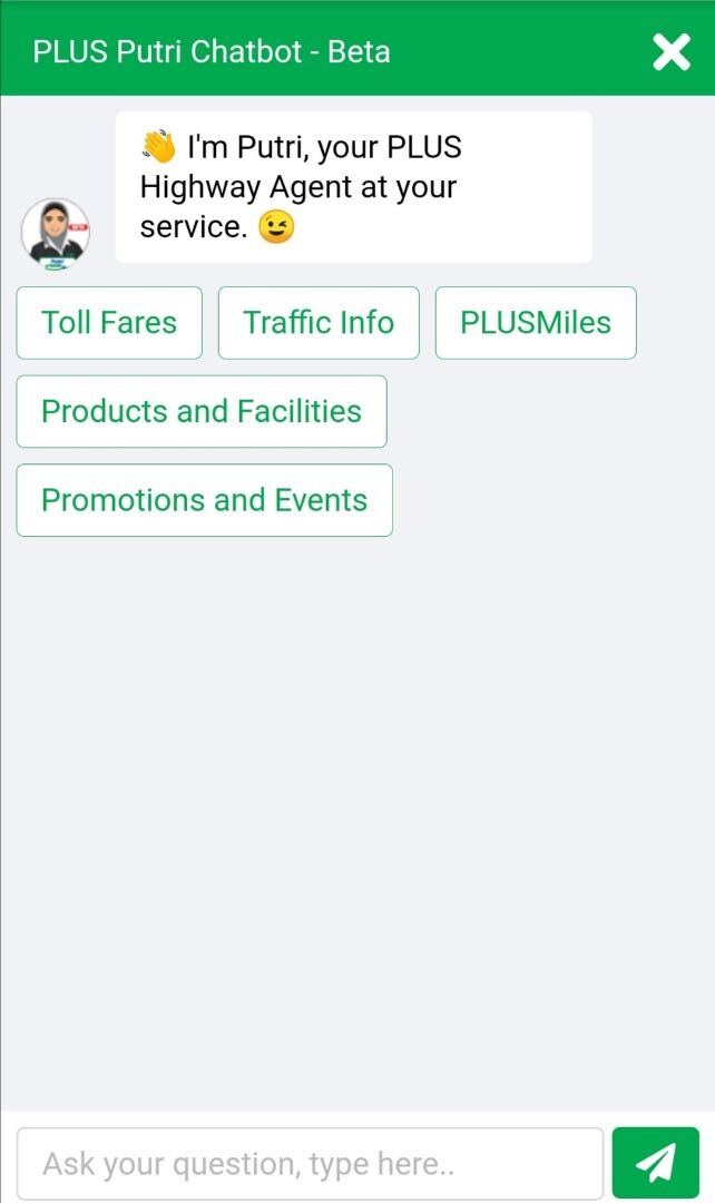 Fitting into the ‘new normal’, which includes looking into how technology can make our lives easier during the pandemic, PLUS Highway introduces PUTRI, which stands for PLUS Texting Realtime Interface. It can also be considered as the highway industry’s first ever chatbot.