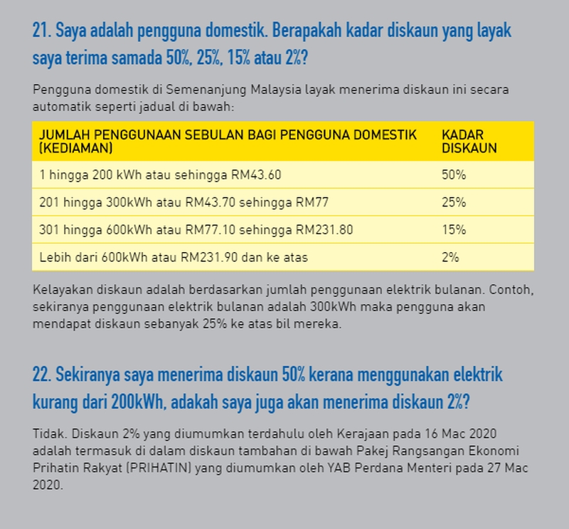 According to Tenaga Nasional Berhad (TNB), more than 80% of residential users will receive discounts between 15% to 50% on electricity usage with a maximum limit of 600kWh per month between 1st April to 30th September 2020.