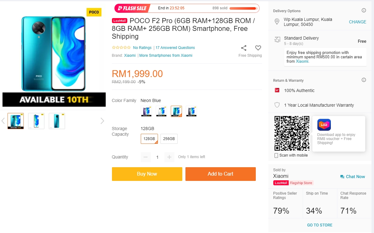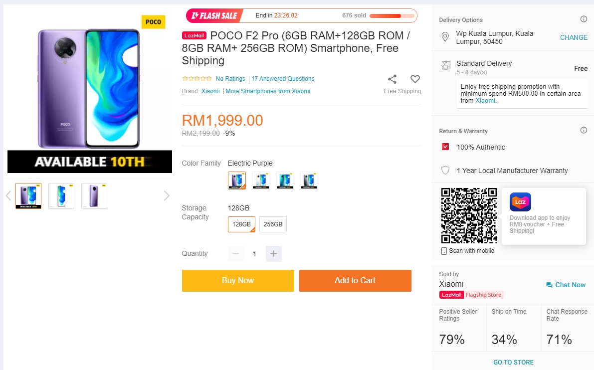[ UPDATE 10/06/2020 12:34 ]: It appears to be another new batch of Poco F2 Pro 128GB that’s going for RM1,999 on Lazada. All colours are still available. If you’re still interested, you better be quick.