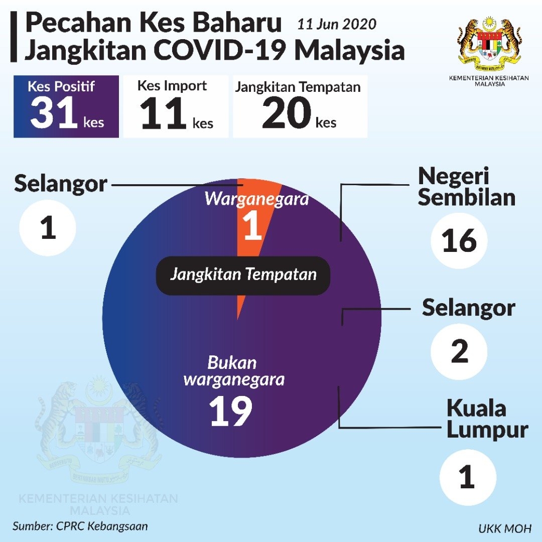 Out of the 31 cases reported today, 11 are imported from Indonesia while 20 are transmitted locally. From the local cases, there’s one case involving a Malaysian in Selangor while the remaining 19 are foreigners.