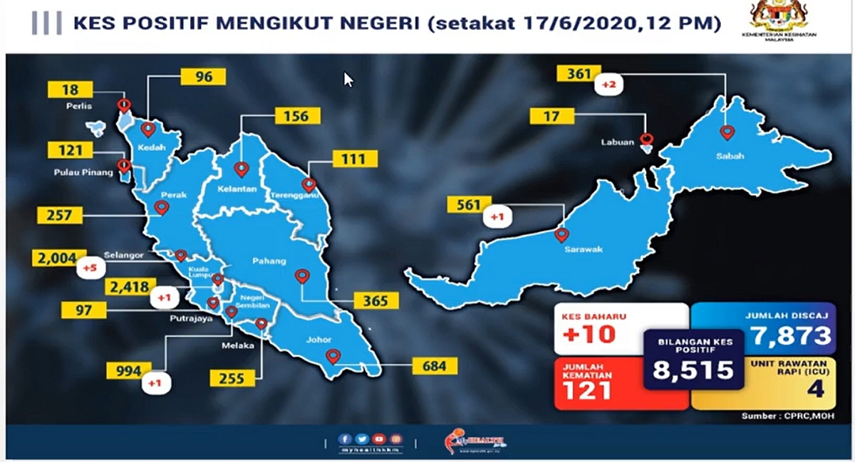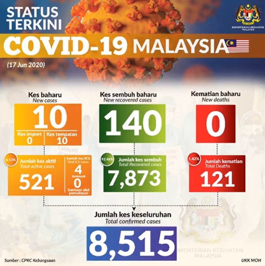 The Ministry of Health has reported 10 new COVID-19 cases in Malaysia today. This brings the total number of infections to 8,515. Fortunately, there are no new deaths reported and the death toll remains at 121.