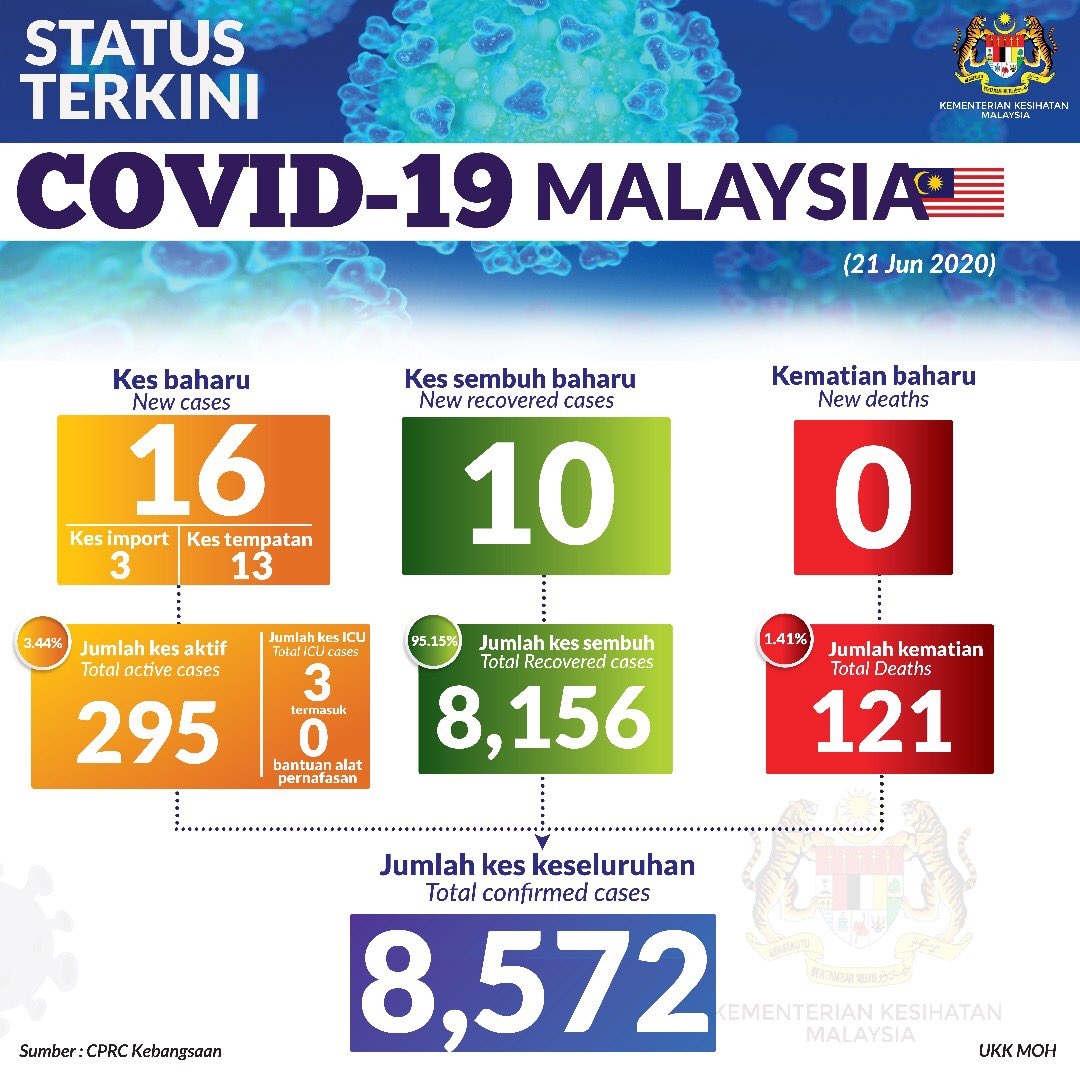 Malaysia has recorded 16 new COVID-19 cases today, which brings the total number of infections to 8,572. Fortunately, there are no new deaths recorded today and the death toll remains at 121.