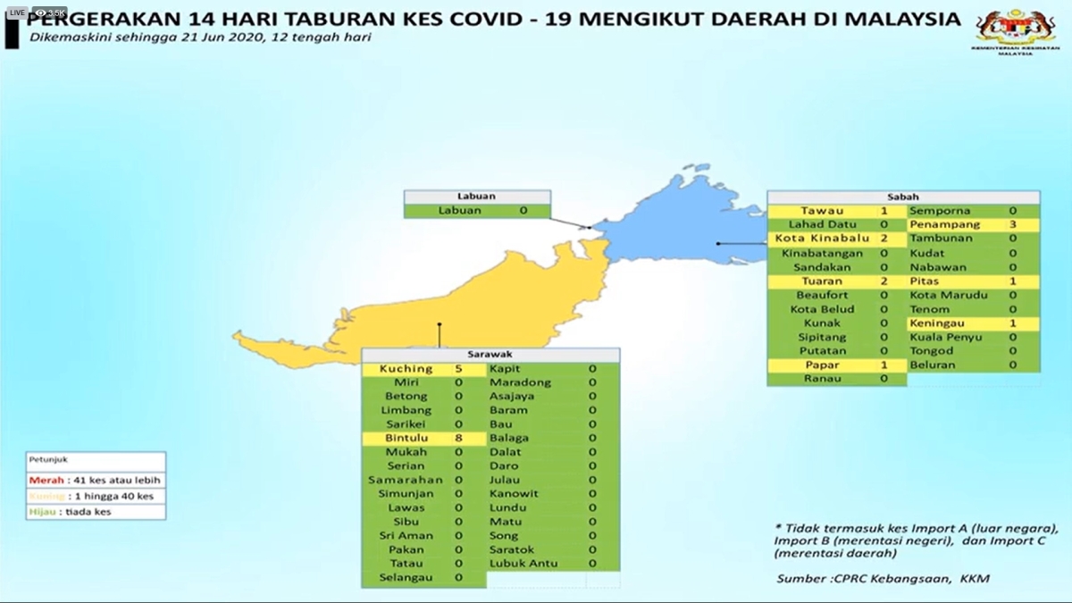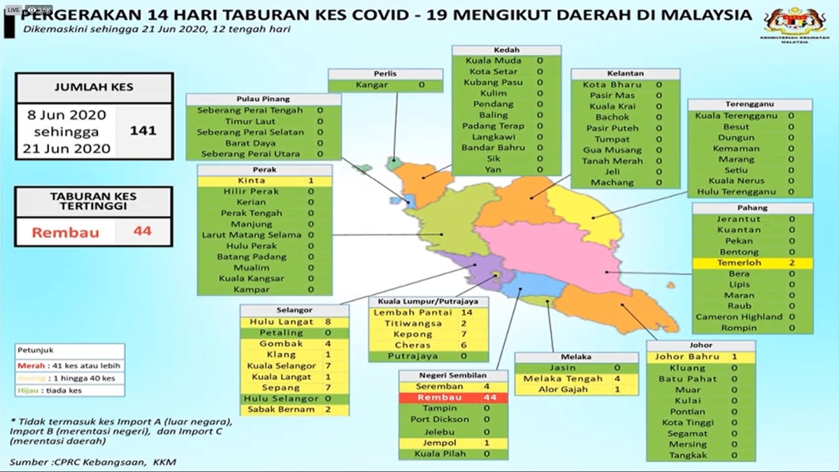 At the moment, the states and territories of Pulau Pinang, Perlis, Kedah, Kelantan, Terengganu, Putrajaya and Labuan are fully green. Meanwhile, Rembau is the only red-zone with 44 active cases due to the Pedas active cluster.