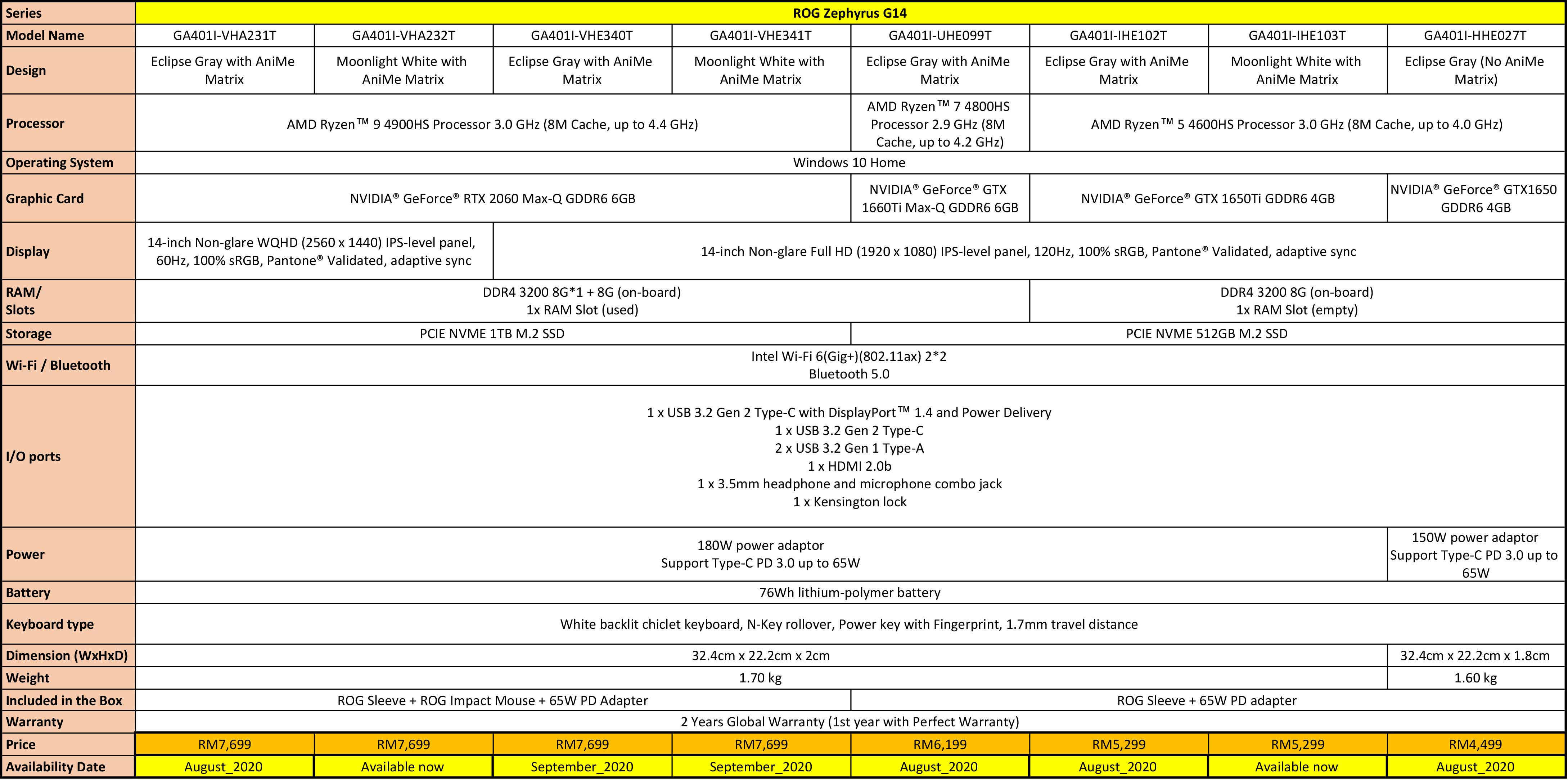 According to Asus, there will be 8 variants of the Zephyrus G14 coming to Malaysia. Currently only two, the GA401I-IHE103T and GA401I-VHA232T, are available now with the rest of the models expected to arrive between August to September 2020.