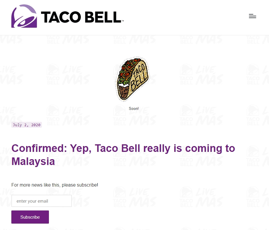 Their website just went live with a simple announcement to confirm that Taco Bell is definitely coming to Malaysia. The restaurant will be managed by Disruptive Concepts Restaurant Group which is the franchise holder for Taco Bell in Malaysia and Singapore.
