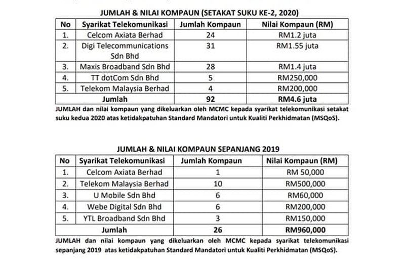The Malaysian Communications and Multimedia Commission (MCMC) has revealed that a total of 92 compounds valued at RM4.6 million have been issued to telcos up to the second quarter of 2020. That’s almost 5 times the total value of compounds issued for the entire year in 2019.