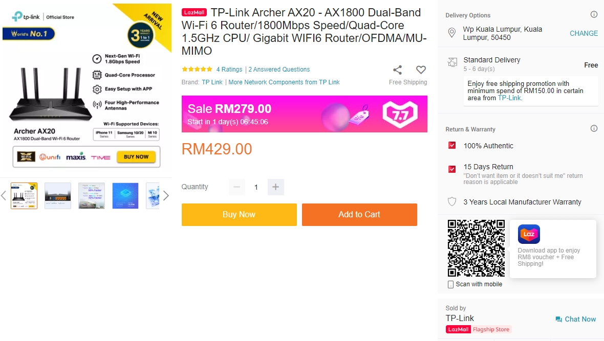 The TP-Link Archer AX20 is also getting a significant price cut during the 7.7 sale. Originally priced at RM429, it can be yours for RM279.