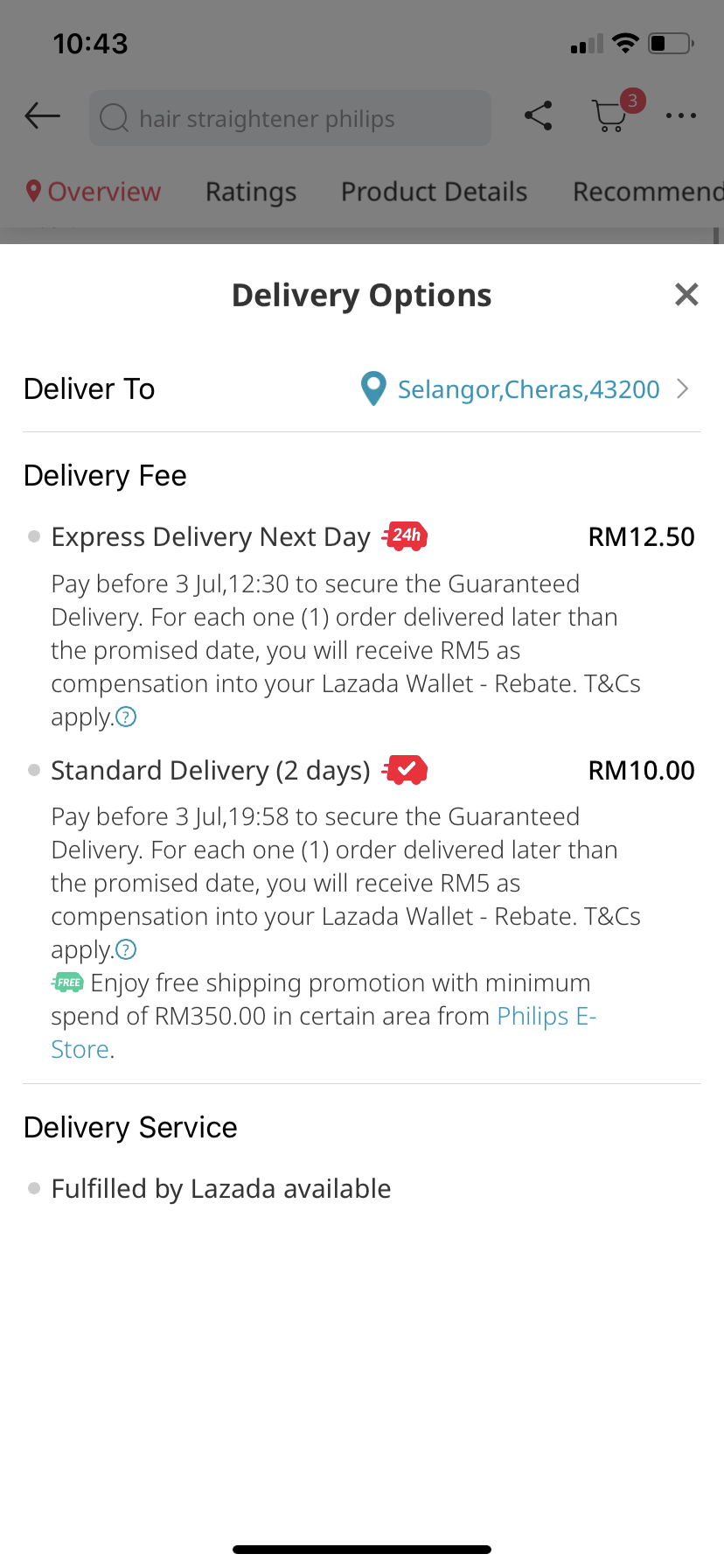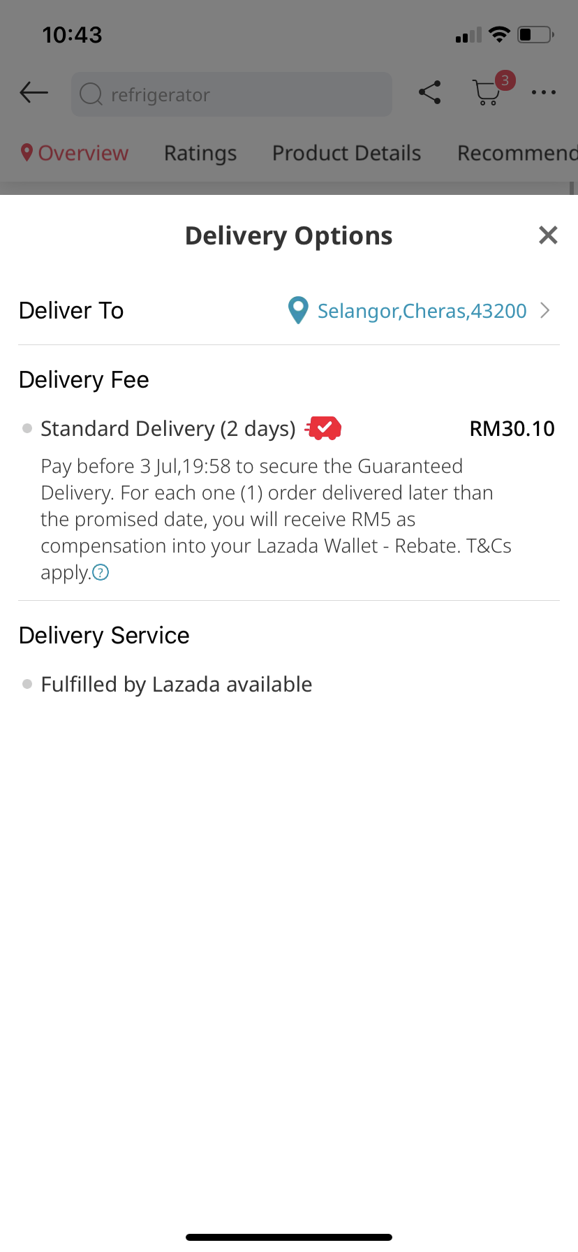 I also noticed that the delivery charge was another RM30.10—which was the only option. However, it said that if I paid before 7.58pm the next day I would get the Guaranteed Delivery promise. I was promised to receive the item in 2 days, or get a RM5 compensation rebate in my Lazada Wallet.