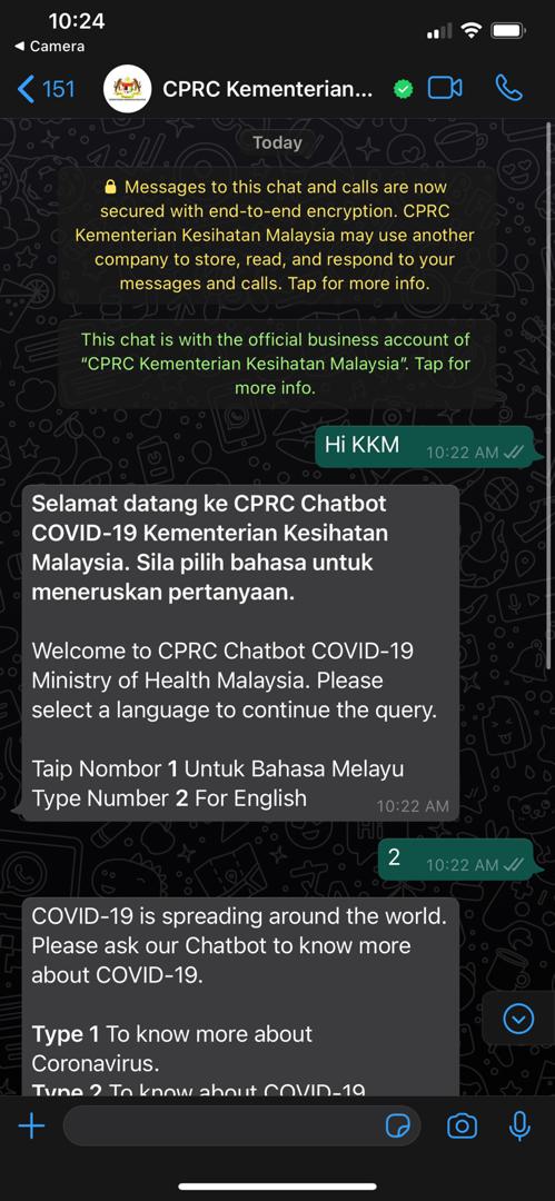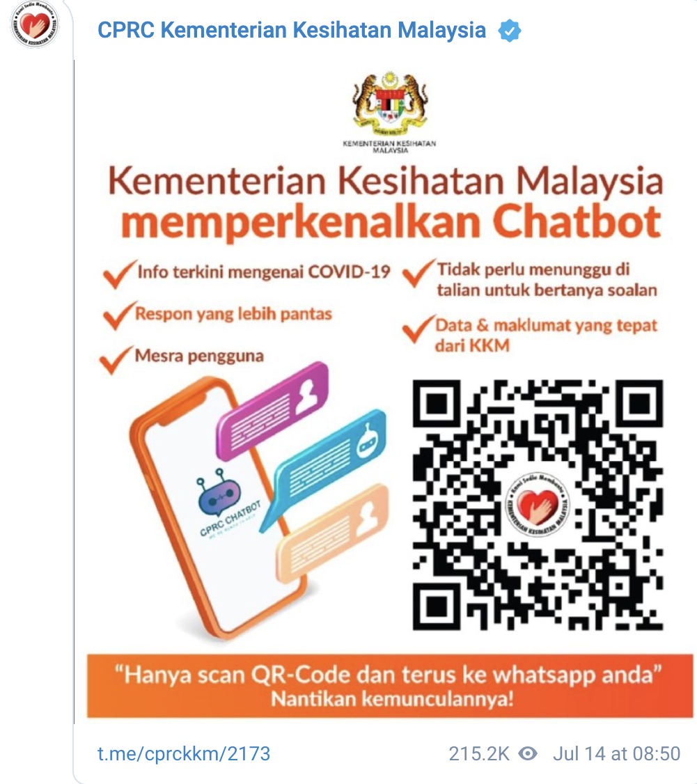 In their Telegram channel, the MOH had posted about the service along with a QR code the public can use to launch the WhatsApp chatbot in their own phones. The ministry also said the chatbot was to “ensure Malaysians would get the most accurate information on COVID-19 and, armed with that knowledge, are able to help the government curb its spread.”