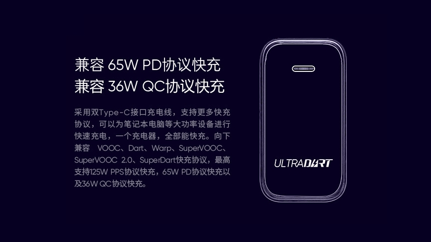 The charging brick is also compatible with other fast charging protocols. This includes 65W Power Delivery which can be used for charging a laptop as well as 36W Quick Charge. It is also compatible with VOOC, Dart, Warp, SuperVOOC and SuperVOOC 2.0 protocols.
