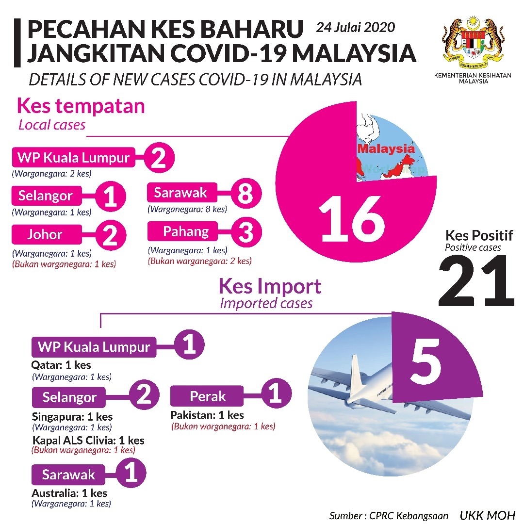 Out of the 21 new cases today, 5 are imported while the remaining 16 are transmitted locally. The imported cases include 3 Malaysians returning from Qatar, Australia and Singapore. There are also 2 foreigners, with one returning from Pakistan and another from a ALS Clivia container ship.