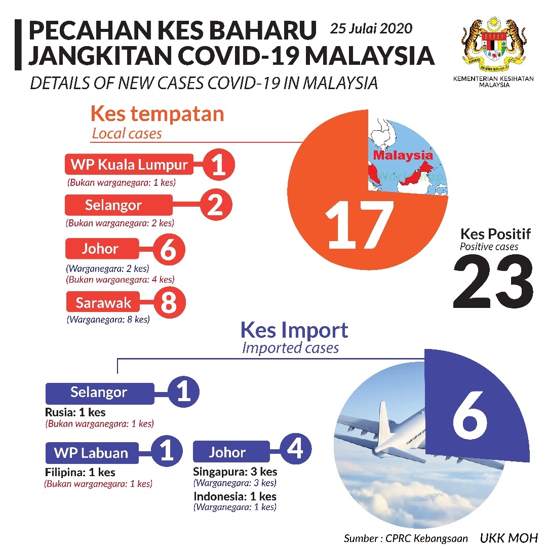 Out of the 23 cases today, 17 are transmitted locally while 6 are imported. The imported cases consist of 3 Malaysians returning from Singapore and 1 Malaysian returning from Indonesia. There’s one foreigner each returning from Russia and the Philippines.