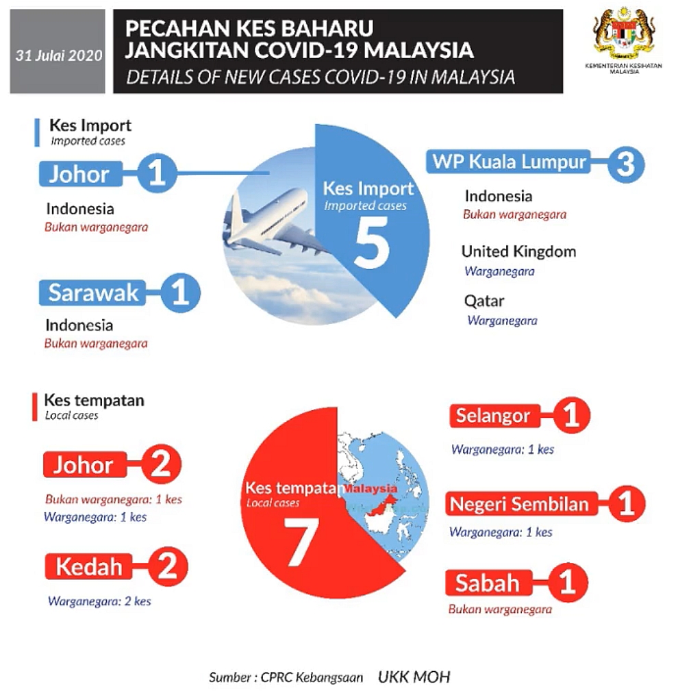 In terms of local cases, there are 2 cases from the PUI Sivagangga cluster in Kedah, 2 cases in Johor and 1 case each in Selangor, Negeri Sembilan and Sabah. 5 out of the 7 local cases are Malaysians.