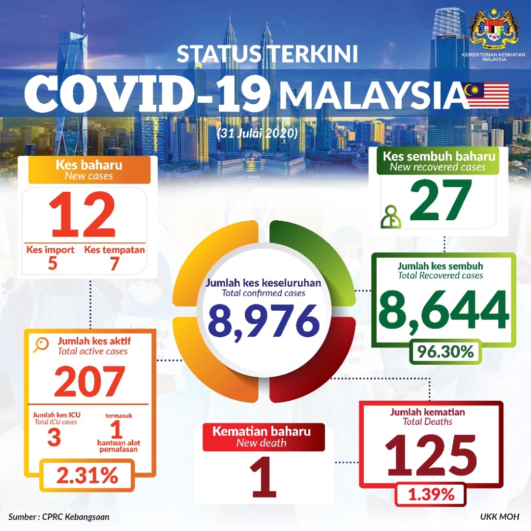 Malaysia records 12 new cases today which brings the total number of COVID-19 infections to 8,976. Unfortunately, there’s one new death reported and the death toll is now 125. Today’s fatality is a 64-year-old man in Sabah who has a history of heart disease and had difficulty breathing since 16th July.