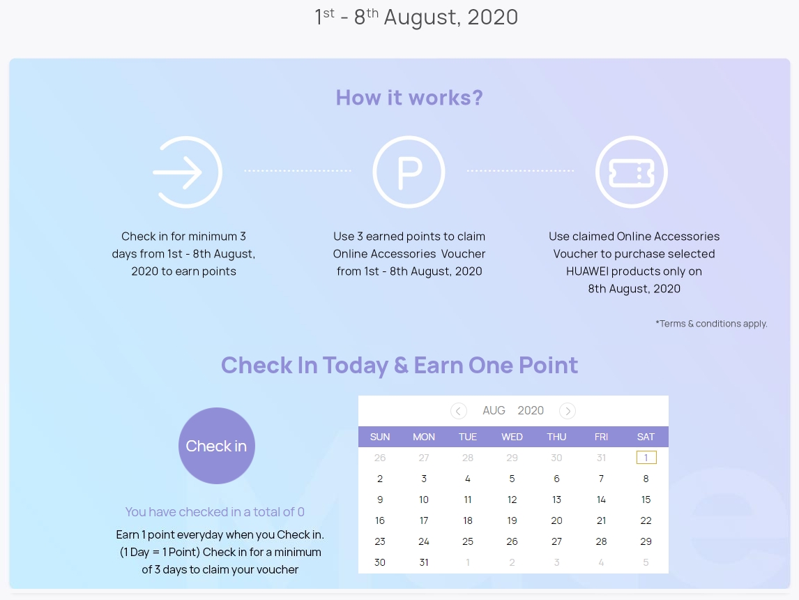 Huawei is also giving away RM88 vouchers for its accessories. You would need to check-in on their online store for a minimum of 3 days to accumulate 3 points required to redeem the voucher. Once you have the voucher, you can use it to purchase accessories with RM88 discount and it’s applicable with a minimum transaction of RM200 in a single purchase.