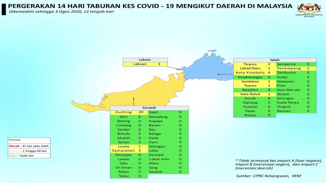 There are currently no red zones in the country as of 12pm today. Kuching has 39 cases, followed by Kubang Pasu at 16 cases and Johor Bahru with 12 cases.