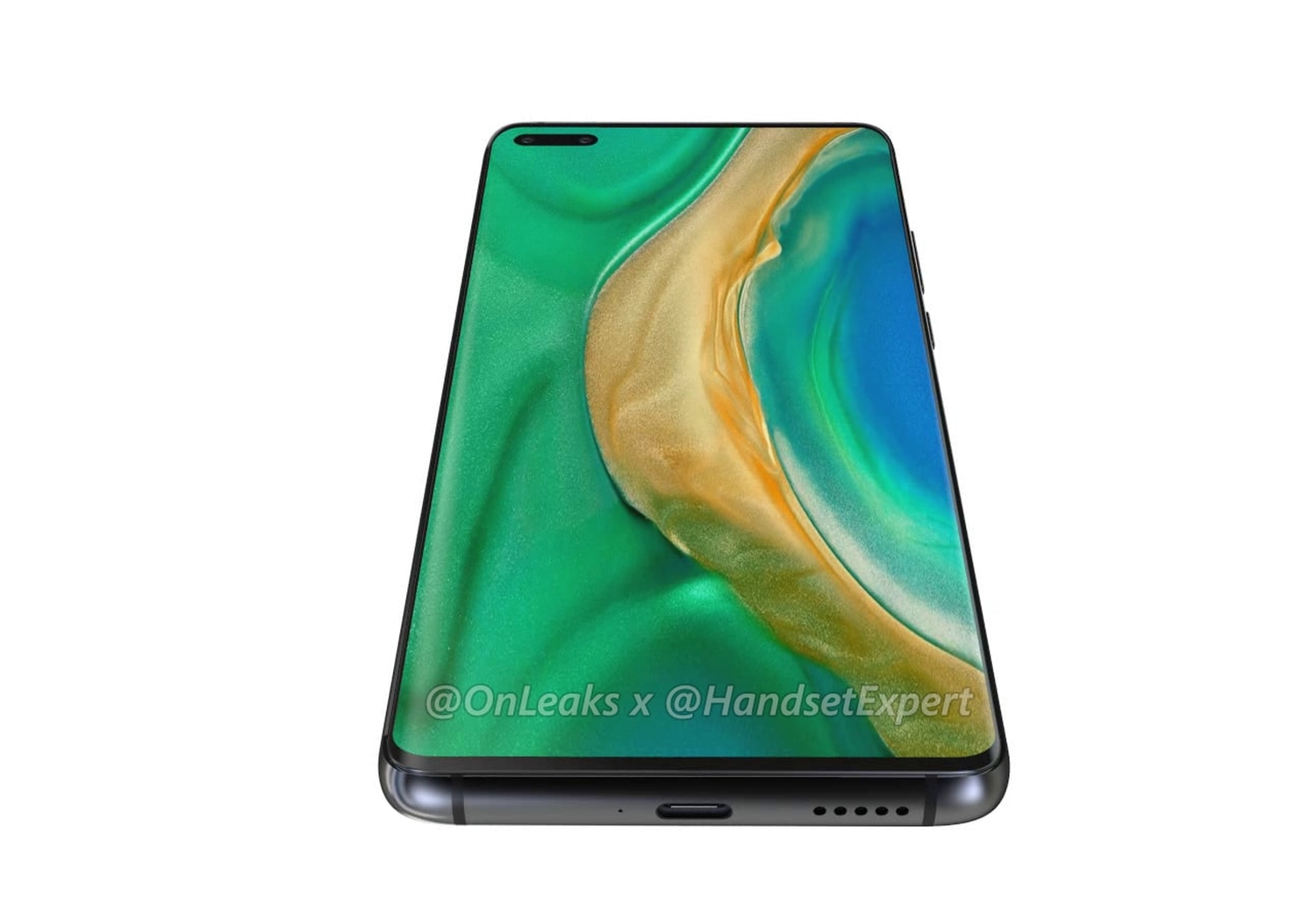 In front, it features what appears to be a 6.4″ dual-curved display and it gets a wide-punch-hole-selfie camera on the top left corner. At a glance, the front looks identical to a Huawei P40 Pro. Interestingly, there are a couple of holes at the top which could house additional sensors. We are hoping that Huawei might include a loud speaker on the top frame which could enable stereo audio playback.