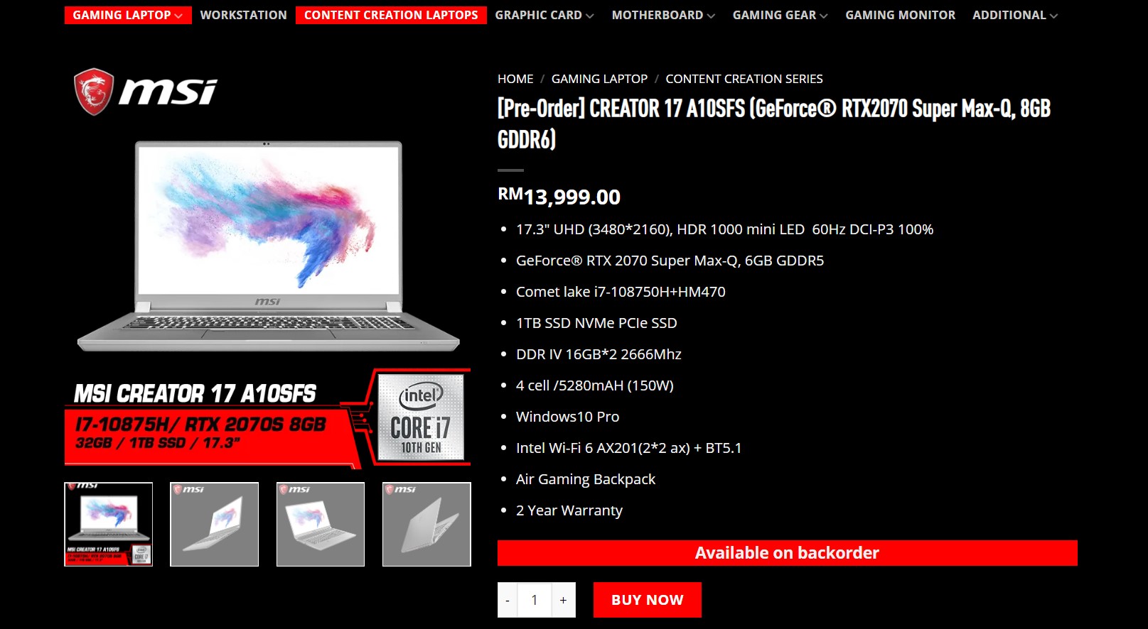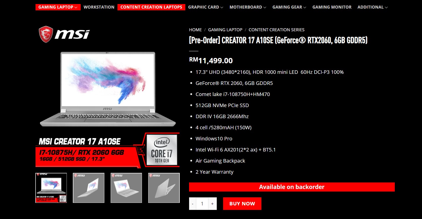 The MSI Creator 17 is listed for pre-order on MSI’s online store and on Lazada. Here is the pricing for the two variants.