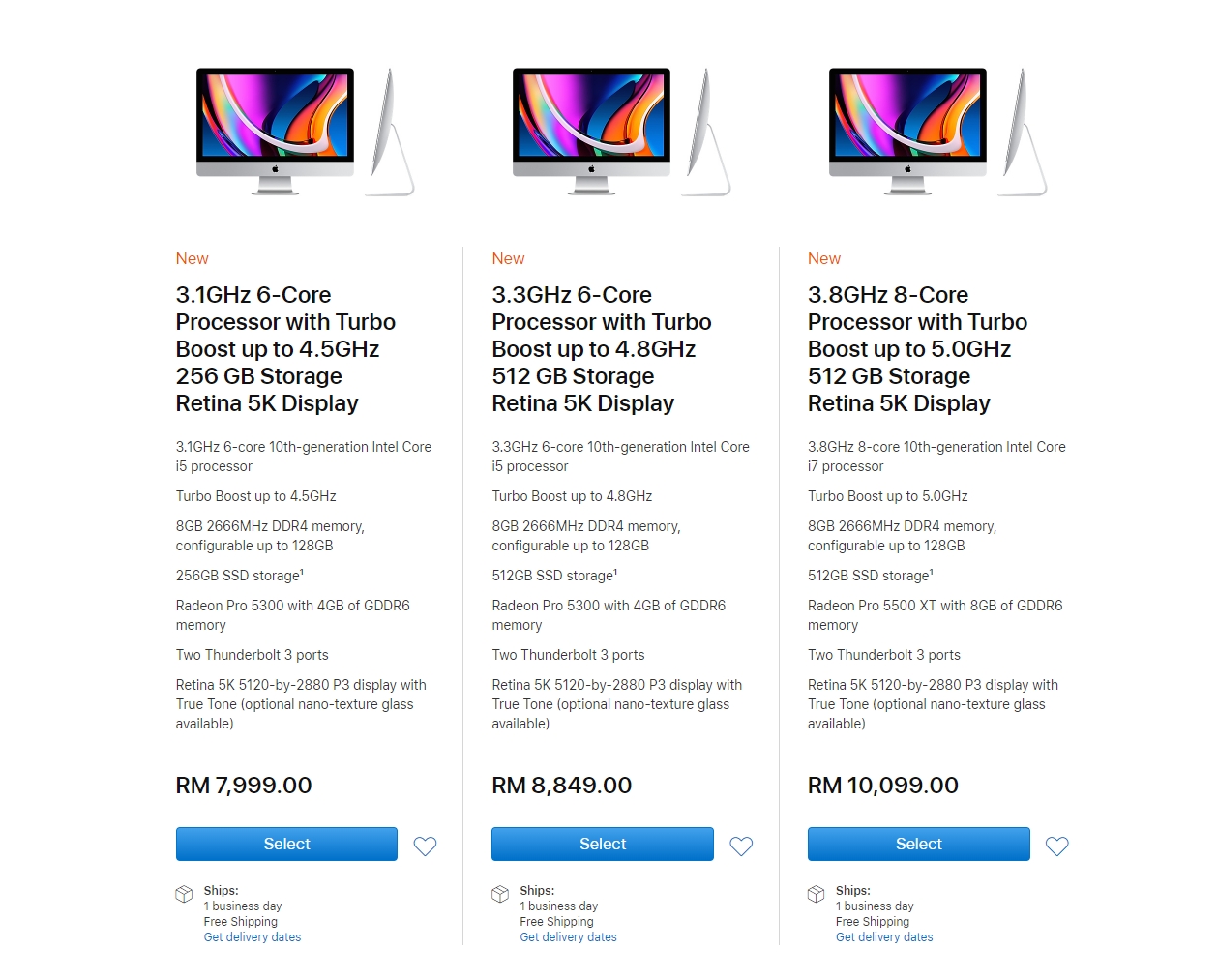 The latest 27″ iMac series is now available for purchase on the official Apple Online Store for Malaysia. The base model with a 3.1GHz 6-core Core i5, 8GB RAM, 256GB SSD, Radeon Pro 5300 graphics costs RM7,999. Moving up a notch, the 27″ iMac with a 3.3GHz 6-core Core i5 with 8GB RAM and 512GB storage is priced at RM8,849.