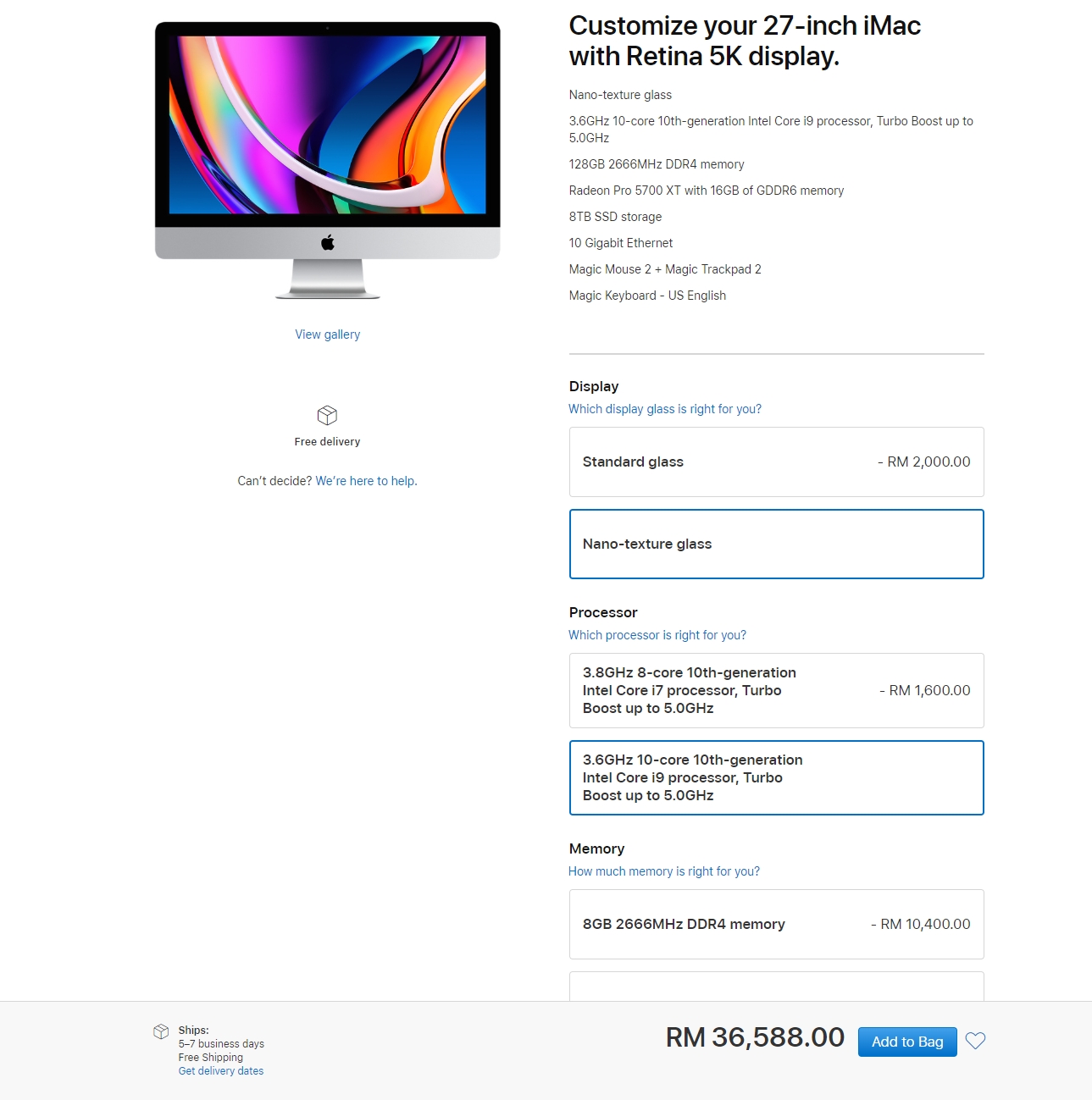 Meanwhile, the higher 8-core Core i7 variant with 8GB RAM, 512GB SSD and Radeon Pro 5500 XT costs RM10,099. For those that want the max performance, a fully-spec 27″ iMac with nano-texture glass, 10-core Core i9, 128GB RAM, 8TB SSD, 10Gbps LAN and the Magic Mouse 2 + Magic Trackpad 2 combo would costs a whopping RM36,588. That’s more than a Proton Saga 1.3 Standard Auto.