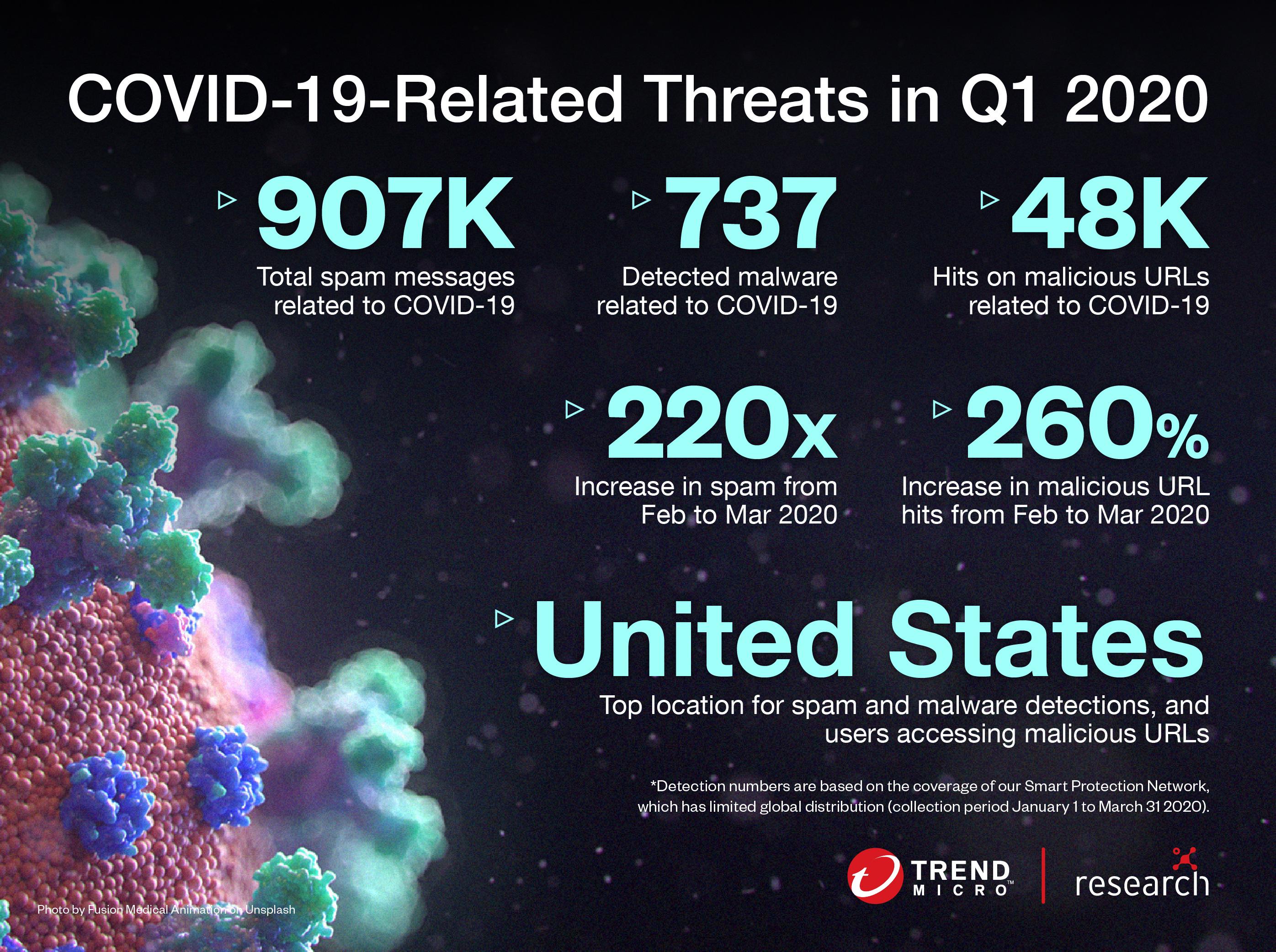 Based on Trend Micro’s latest threat gathering estimates, there were 907,000 spam messages related to COVID-19 sent to users while 737 malware was detected and 48,000 malicious URLs have been generated.