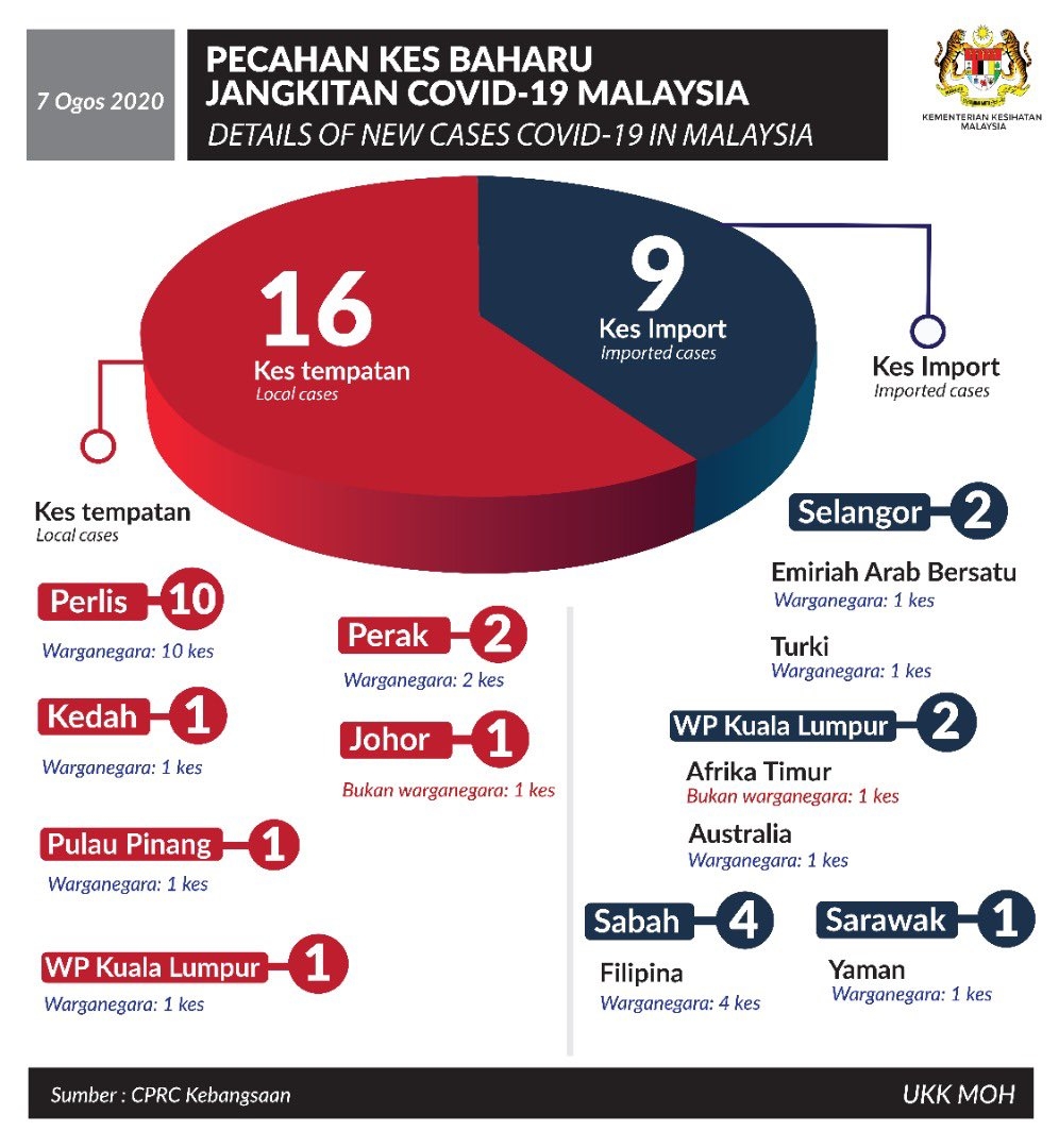 Out of the 25 new cases reported today, 9 are imported while 16 are transmitted locally. The imported cases include 4 Malaysians returning from the Philippines and individual Malaysians returning from Yemen, Australia, Turkey and UAE. There’s one foreigner arriving from Djibouti.