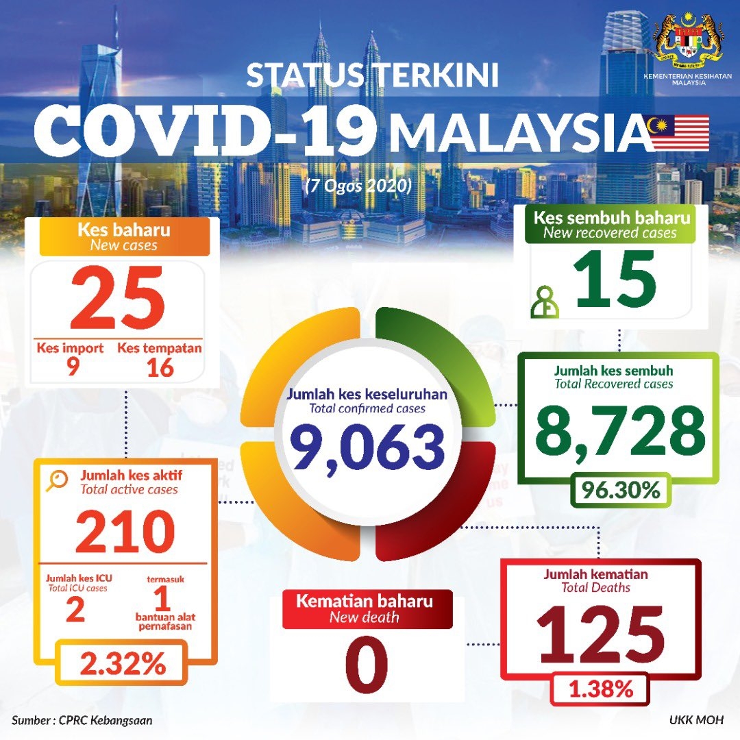 Malaysia has recorded 25 new cases today which brings the total number of COVID-19 cases to 9,063. There are no new deaths today and the death toll remains at 125.