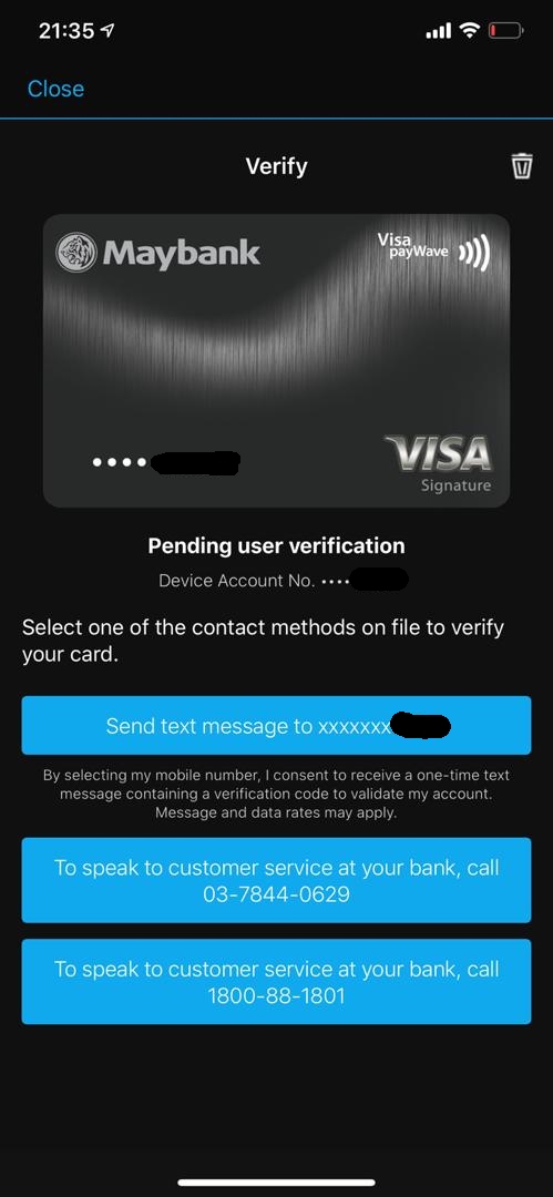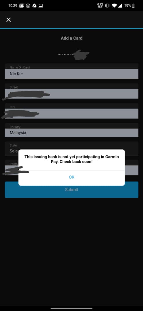 Twitter user @kep3n has also successfully tested out Garmin Pay with a Garmin Fenix 6, with a Maybank Visa debit card. However, when I tried to register a Maybank Mastercard credit card on the Garmin Vivomove Style, the Garmin Connect app responded with a message that the issuing bank is not supported.