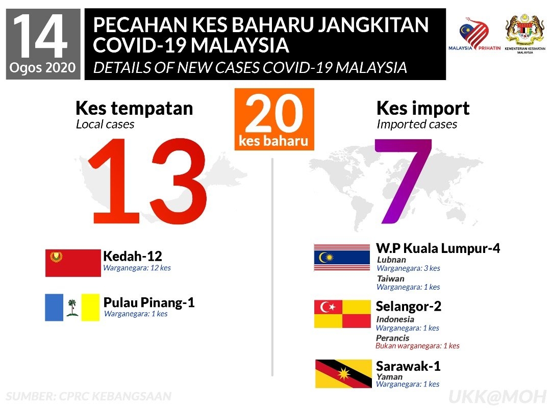 Out of the 20 new cases reported today, 13 are local while 7 cases are imported. The imported cases include 3 Malaysians returning from Lebanon and 1 Malaysian each returning from Yemen, Indonesia and Taiwan. There’s also one foreigner that arrived from France.