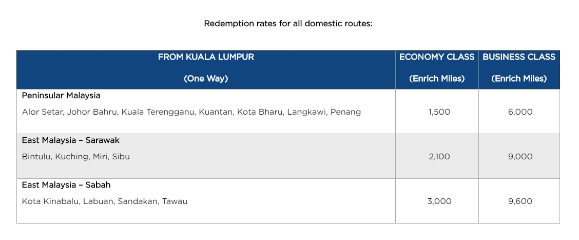 The promotion is open to all Enrich members that have accrued sufficient Miles in a single account and you can’t combine points from multiple accounts. You can use it for either one-way or return flights but it is only valid for flights operated by Malaysia Airlines from Kuala Lumpur to/within Malaysia and East Malaysia or vice versa. For flights from Kuala Lumpur to destinations in West Malaysia, a one-way ticket costs 1,500 miles for economy and 6,000 miles for business class.
