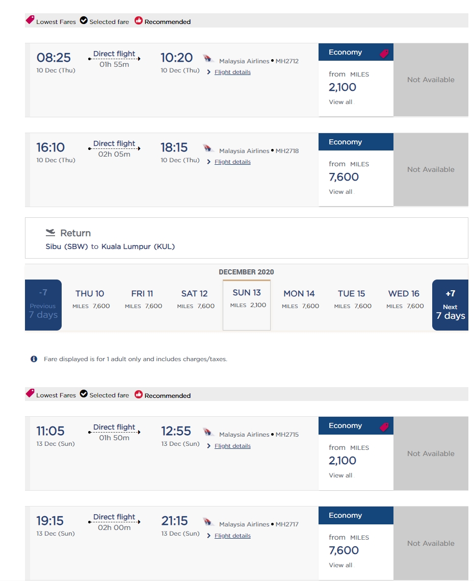 For one-way flights from Kuala Lumpur to Sarawak (Kuching, Sibu, Bintulu Miri), it is 2,100 miles for economy and 9,000 miles for business. Meanwhile, for one-way flights from Kuala Lumpur to Sabah (Kota Kinabalu, Sandakan, Tawau and Labuan), it is 3,000 miles for economy and 9,600 miles for business.