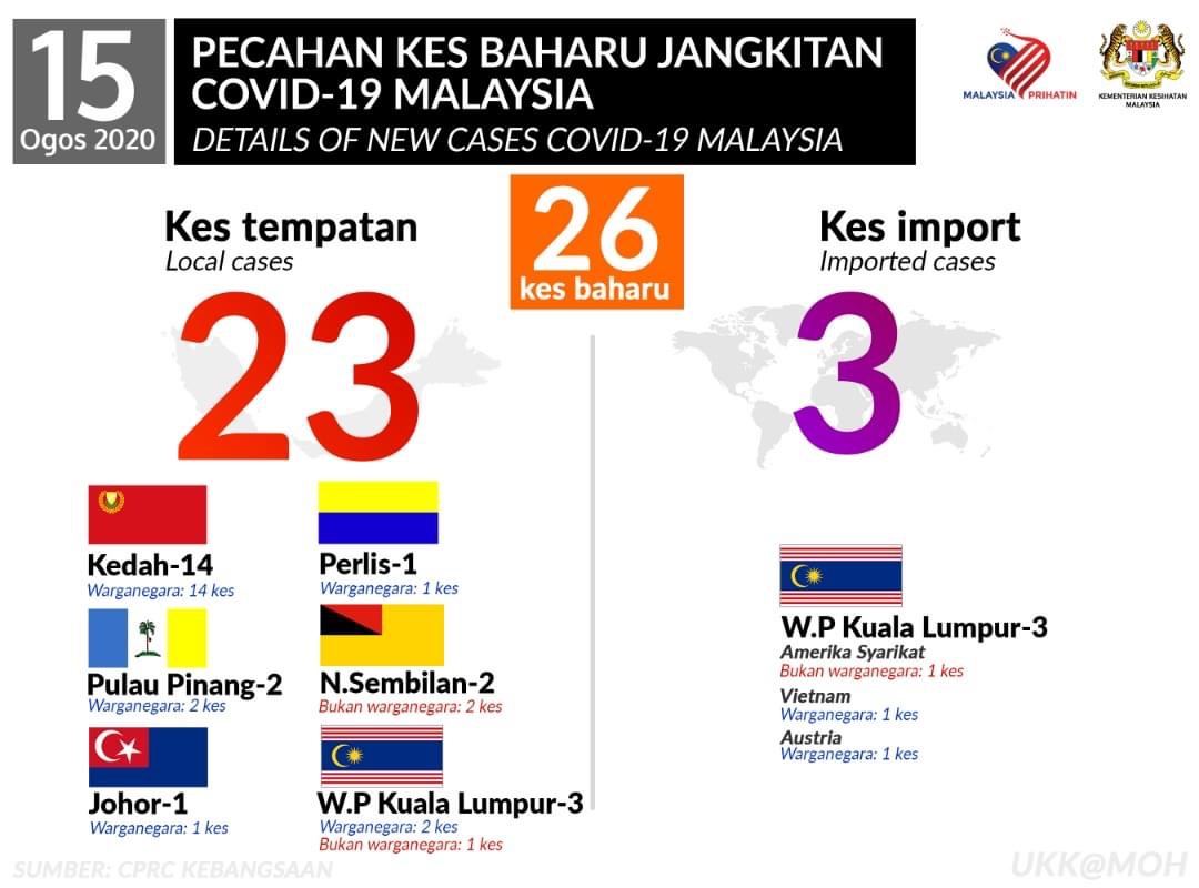 Out of the 26 new COVID-19 cases today, 3 are imported while 23 are transmitted locally. The imported cases consists of Malaysians returning from Austria and Vietnam, and a foreigner arriving from the United States.