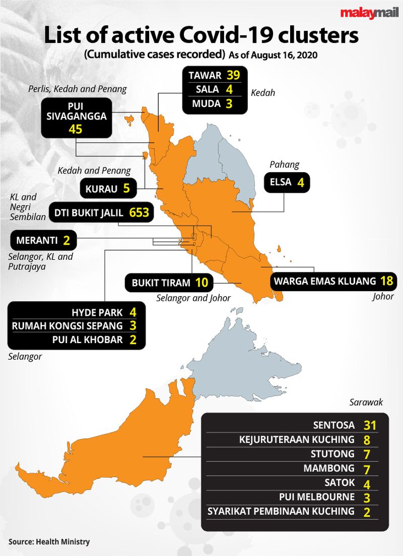 With less than two weeks until the expiration of the RMCO on August 31, Malay Mail has compiled a list of most active Covid-19 clusters.
