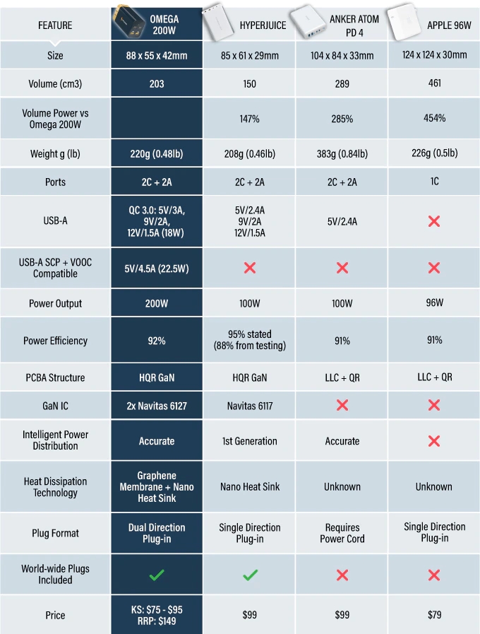 The 200W Omega Charger comes with 2x USB-C and 2x USB-A ports that provide a total maximum output of 200W. Weighing 220g with dimensions of 88mm x 55mm x 42mm, the charger is said to be up to 66% smaller than traditional chargers.