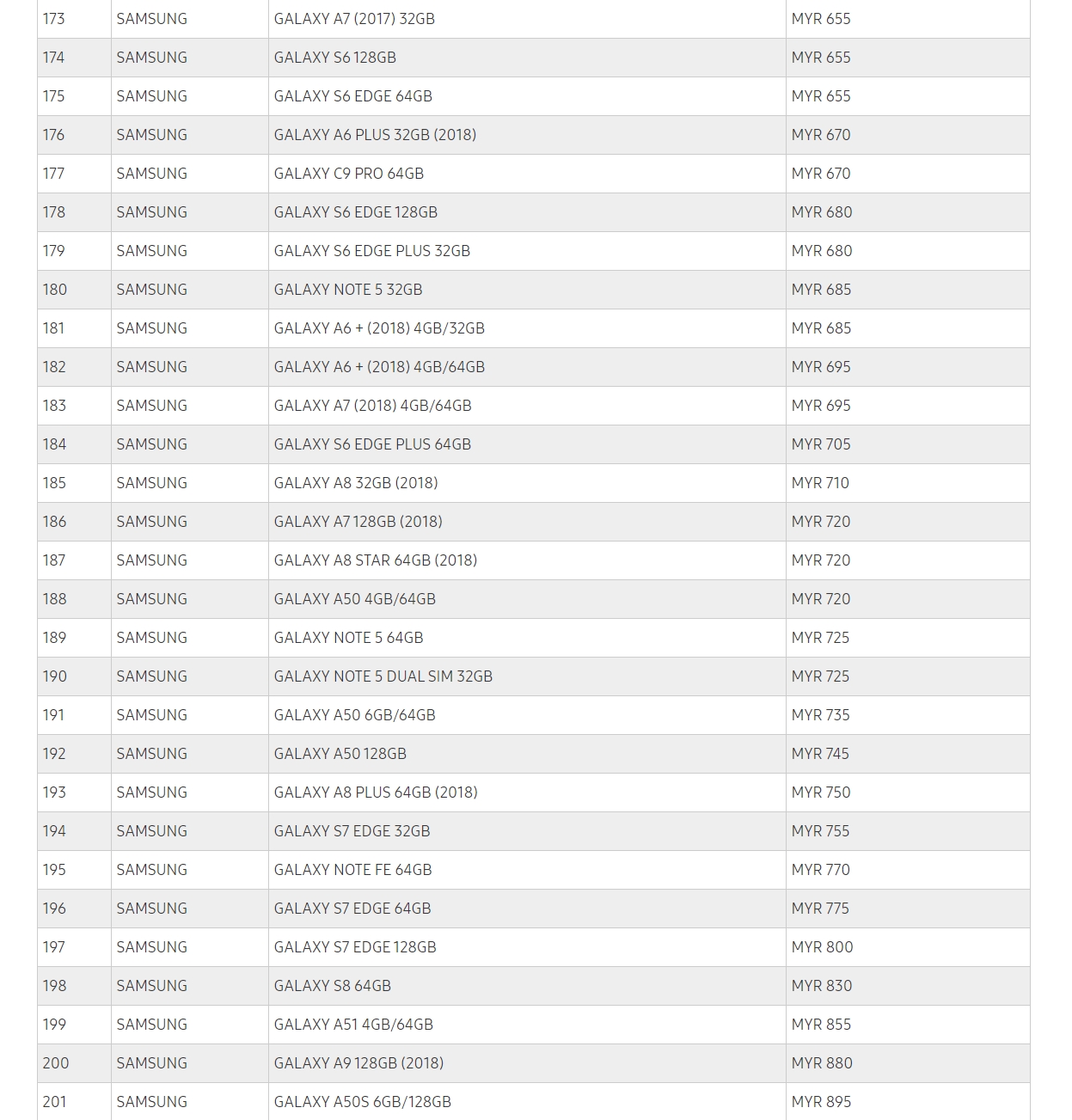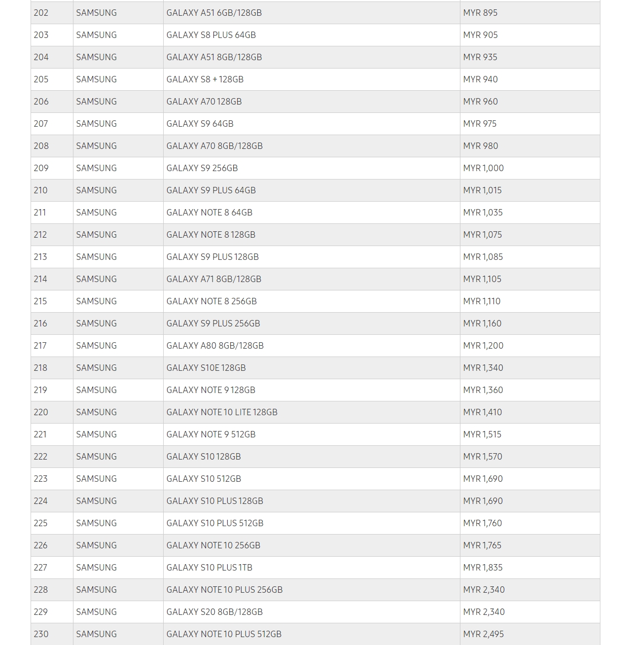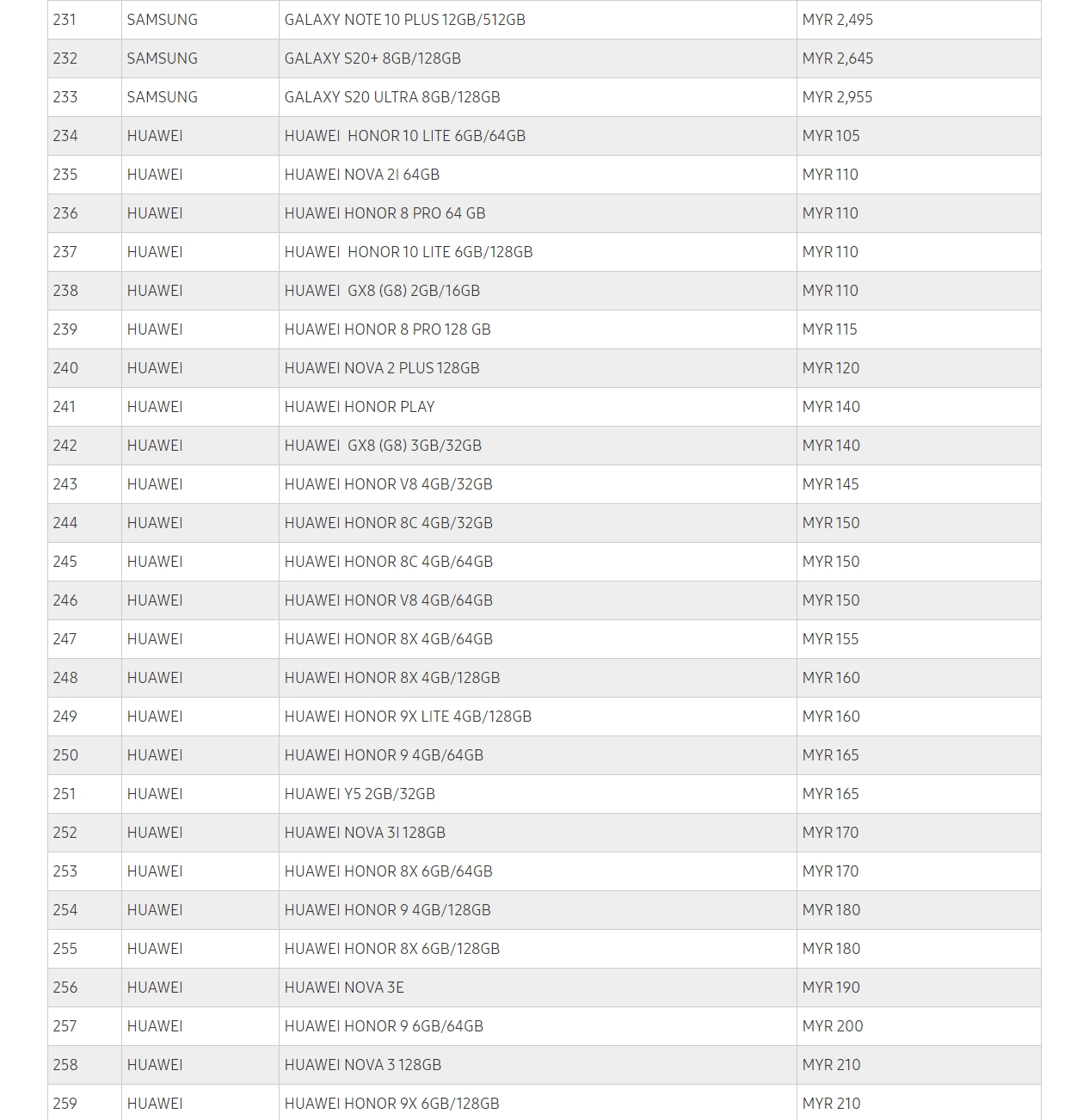 Apple devices typically have higher resale value compared to Android models. The iPhone 11 Pro Max 512GB is listed at RM4,005, followed by the iPhone 11 Pro 512GB at RM3,795. Meanwhile, the Galaxy S20 Ultra 128GB that was launched 6 months ago is valued at RM2,995 while the S20+ 128GB is valued at RM2,645.