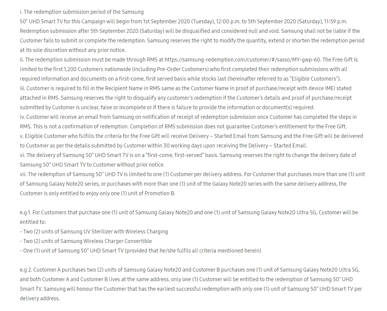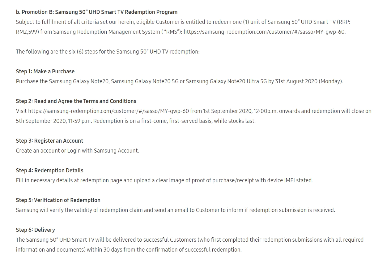 The Samsung 50″ UHD Smart TV Redemption program is limited to 1,200 units. It is open to those that purchase the Galaxy Note 20, Note 20 5G or the Note 20 Ultra 5G by 31st August 2020 and this also includes pre-order customers. The redemption is offered on a first-come, first-served basis, while stocks last.